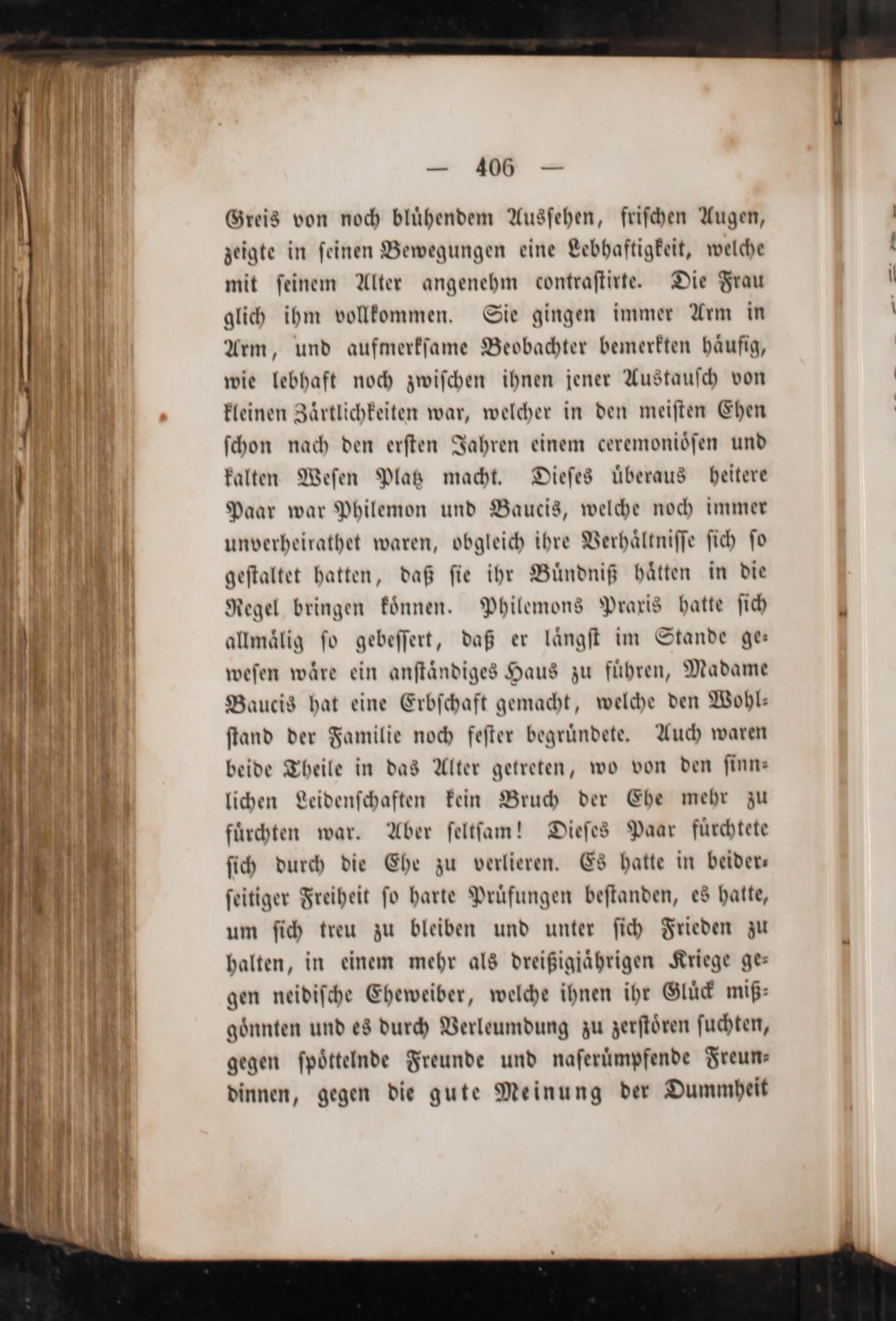 Greis von noch bluͤhendem Ausſehen, friſchen Augen, zeigte in ſeinen Bewegungen eine Lebhaftigkeit, welche mit ſeinem Alter angenehm contraſtirte. Die Frau glich ihm vollkommen. Sie gingen immer Arm in Arm, und aufmerkſame Beobachter bemerkten haͤufig, wie lebhaft noch zwiſchen ihnen jener Austauſch von kleinen Zaͤrtlichkeiten war, welcher in den meiſten Ehen ſchon nach den erſten Jahren einem ceremonioͤſen und kalten Weſen Platz macht. Dieſes uͤberaus heitere Paar war Philemon und Baucis, welche noch immer unverheirathet waren, obgleich ihre Verhaͤltniſſe ſich ſo geſtaltet hatten, daß ſie ihr Buͤndniß hätten in die Regel bringen koͤnnen. Philemons Praxis hatte ſich allmaͤlig ſo gebeſſert, daß er laͤngſt im Stande ge⸗ weſen wäre ein anſtaͤndiges Haus zu fuͤhren, Madame Baucis hat eine Erbſchaft gemacht, welche den Wohl⸗ ſtand der Familie noch feſter begruͤndete. Auch waren beide Theile in das Alter getreten, wo von den ſinn⸗ lichen Leidenſchaften kein Bruch der Ehe mehr zu fuͤrchten war. Aber ſeltſam! Dieſes Paar fuͤrchtete ſich durch die Ehe zu verlieren. Es hatte in beider⸗ ſeitiger Freiheit ſo harte Prufungen beſtanden, es hatte, um ſich treu zu bleiben und unter ſich Frieden zu halten, in einem mehr als dreißigiährigen Kriege ge⸗ gen neidiſche Eheweiber, welche ihnen ihr Gluͤck miß⸗ goͤnnten und es durch Verleumdung zu zerſtören ſuchten, gegen ſpoͤttelnde Freunde und naſeruͤmpfende Freun⸗ dinnen, gegen die gute Meinung der Dummheit