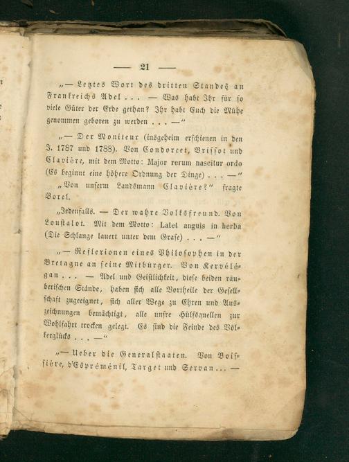 „— Reflexionen eines Philoſophen in der Bretagne an ſeine Mitbürger. Von Kervélé⸗ gan...— Adel und Geiſttlichkeit, dieſe beiden räu⸗ beriſchen Stände, haben ſich alle Vortheile der Geſell⸗ ſchaft zugeeignet, ſich aller Wege zu Ehren und Aus⸗ zeichnungen bemächtigt, alle unſre Hülfsquellen zur Wohlfahrt trocken gelegt. Es ſind die Feinde des Völ⸗ kerglücks...— ⸗