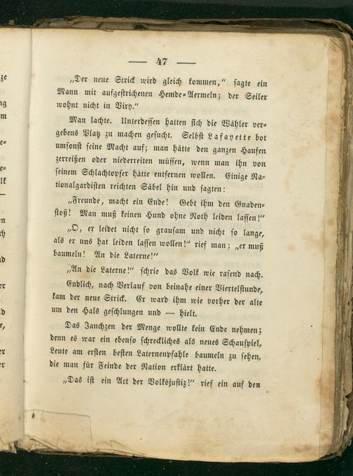 6⸗ umſonſt ſeine Macht auf; man hätte den ganzen Haufen zerreißen oder niederreiten müſſen, wenn man ihn von e⸗ ſeinem Schlachtopfer hätte entfernen wollen. Einige Na⸗ lk tionalgardiſten reichten Säbel hin und ſagten: —„Freunde, macht ein Ende! Gebt ihm den Gnaden⸗ ſtoß! Man muß keinen Hund ohne Noth leiden laſſen!“ 4„O, er leidet nicht ſo grauſam und nicht ſo lange, 9 als er uns hat leiden laſſen wollen!“ rief man;„er muß* — baumeln! An die Laterne!“ „An die Laterne!“ ſchrie das Volk wie raſend nach. 1 er Endlich, nach Verlauf von beinahe einer Viertelſtunde, 4 kam der neue Strick. Er ward ihm wie vorher der alte d um den Hals geſchlungen und— hielt. b e, Das Jauchzen der Menge wollte kein Ende nehmen; denn es war ein ebenſo ſchreckliches als neues Schauſpiel, er Leute am erſten beſten Laternenpfahle baumeln zu ſehen, r die man für Feinde der Nation erklärt hatte.