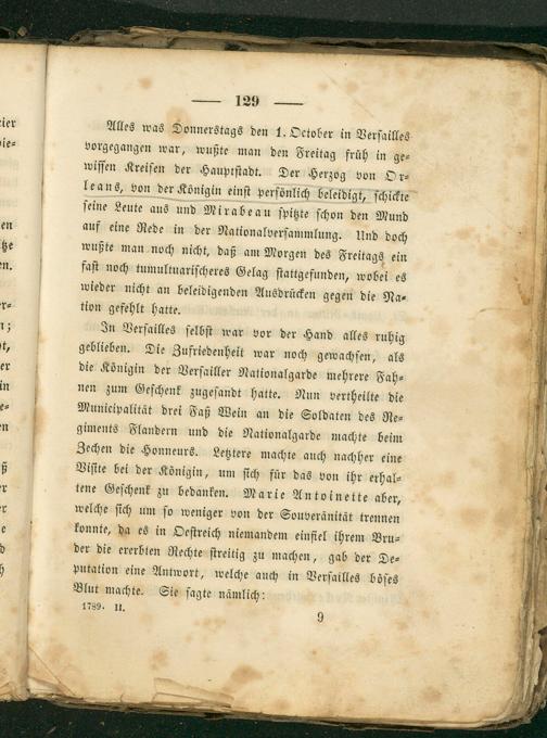 In Verſailles ſelbſt war vor der Hand alles ruhig geblieben. Die Zufriedenheit war noch gewachſen, als die Königin der Verſailler Nationalgarde mehrere Fah⸗ nen zum Geſchenk zugeſandt hatte. Nun vertheilte die Municipalität drei Faß Wein an die Soldaten des Re⸗ giments Flandern und die Nationalgarde machte beim Zechen die Honneurs. Letztere machte auch nachher eine Viſite bei der Königin, um ſich für das von ihr erhal⸗ tene Geſchenk zu bedanken. Marie Antoinette aber, welche ſich um ſo weniger von der Souveränität trennen konnte, da es in Oeſtreich niemandem einfiel ihrem Bru⸗ der die ererbten Rechte ſtreitig zu machen, gab der De⸗ putation eine Antwort, welche auch in Verſailles böſes