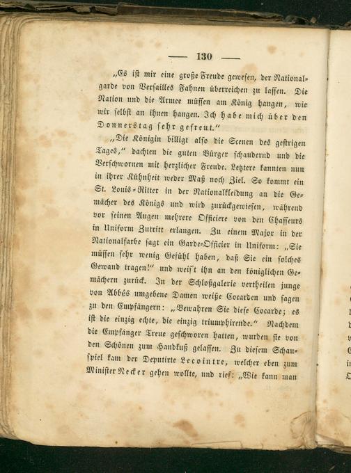 mächern zurück. In der Schloßgalerie vertheilen junge von Abbés umgebene Damen weiße Cocarden und ſagen zu den Empfängern:„Bewahren Sie dieſe Cocarde; es i*ſt die einzig echte, die einzig triumphirende.“ Nachdem die Empfänger Treue geſchworen hatten, wurden ſte von den Schönen zum Handkuß gelaſſen. Zu dieſem Schau⸗ ſpiel kam der Deputirte Lecointre, welcher eben zum Miniſter Necker gehen wollte, und rief:„Wie kann man