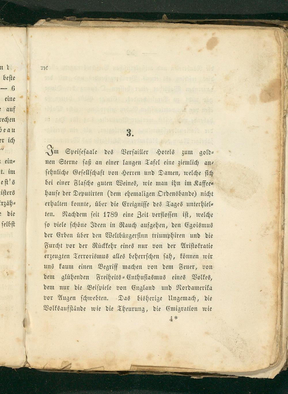 Im Speiſeſaale des Verſailler Hotels zum gold⸗ nen Sterne ſaß an einer langen Tafel eine ziemlich an⸗ ſehnliche Geſellſchaft von Herren und Damen, welche ſich bei einer Flaſche guten Weines, wie man ihn im Kaffee⸗ hauſe der Deputirten(dem ehemaligen Ordensbande) nicht erhalten konnte, über die Ereigniſſe des Tages unterhiel⸗ ten. Nachdem ſeit 1789 eine Zeit verfloſſen iſt, welche ſo viele ſchöne Ideen in Rauch aufgehen, den Egoismus der Erben über den Weltbürgerſinn triumphiren und die Furcht vor der Rückkehr eines nur von der Ariſtokratie erzeugten Terrorismus alles beherrſchen ſah, können wir uns kaum einen Begriff machen von dem Feuer, von dem glühenden Freiheits⸗Enthuſiasmus eines Volkes, dem nur die Beiſpiele von England und Nordamerika vor Augen ſchwebten. Das bisherige Ungemach, die Volksaufſtände wie die Theurung, die Emigration wie