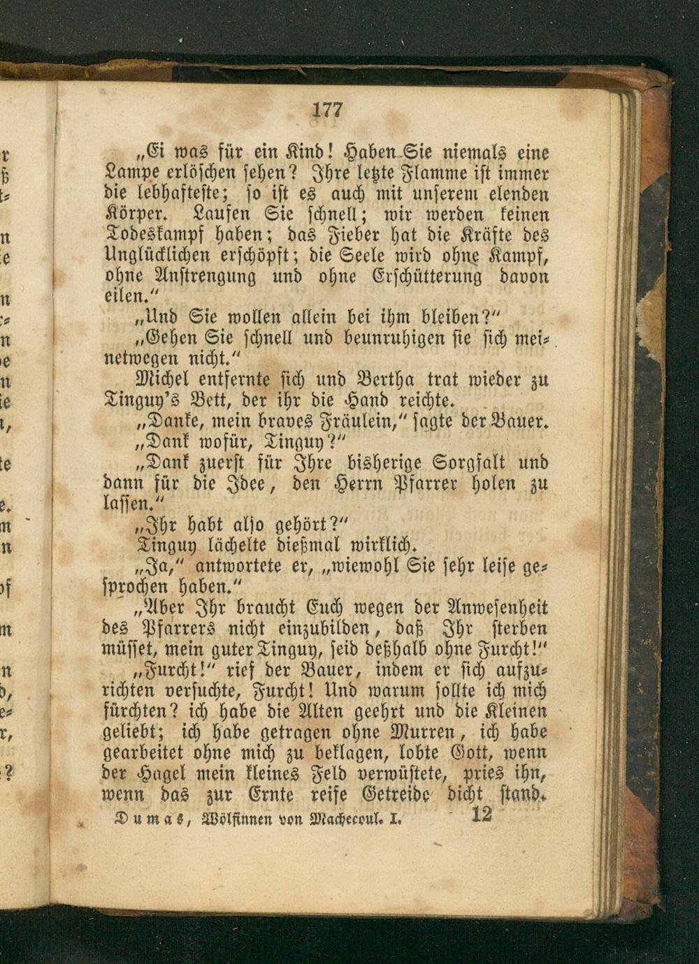 „Ei was für ein Kind! Haben Sie niemals eine Lampe erlöſchen ſehen? Ihre letzte Flamme iſt immer die lebhafteſte; ſo iſt es auch mit unſerem elenden Körper. Laufen Sie ſchnell; wir werden keinen Todeskampf haben; das Fieber hat die Kräfte des Unglücklichen erſchöpft; die Seele wird ohne Kampf, hne Anſtrengung und ohne Erſchütterung davon eilen.“
