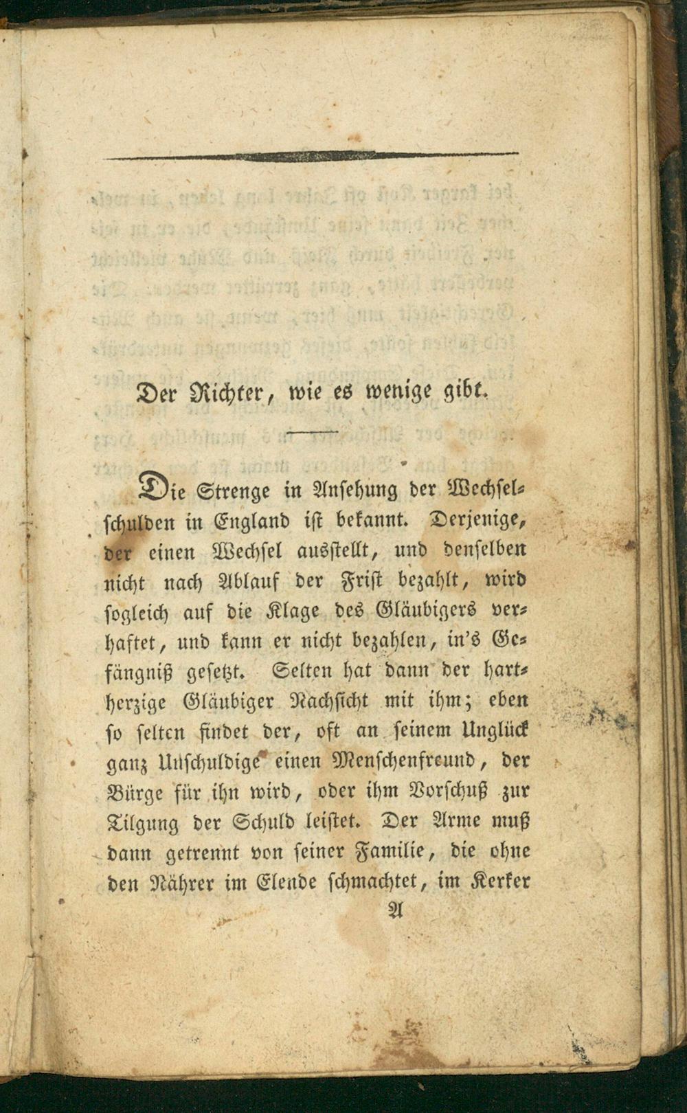 einen Wechſel ausſtellt, und denſelben nicht nach Ablauf der Friſt bezahlt, wird ſogleich auf die Klage des Gläubigers ver⸗ haftet, und kann er nicht bezahlen, in's Ge⸗ fängniß geſetzt. Selten hat dann der hart⸗ herzige Gläubiger Nachſicht mit ihm; eben* ſo ſelten findet der, oft an ſeinem Unglück ganz Unſchuldige einen Menſchenfreund, der Bürge für ihn wird, oder ihm Vorſchuß zur Tilgung der Schuld leiſtet. Der Arme muß dann getrennt von ſeiner Familie, die ohne den Nährer im Elende ſchmachtet, im Kerker A