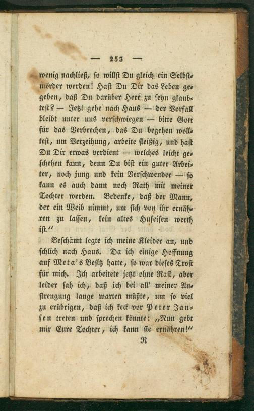 enig nachließ, ſo willſt Du gleich ein Selbſt⸗ morder werden! Haſt Du Dir das Leben ge⸗ geben, daß Du darüber Herr zu ſeyn glaub⸗ teſt?— Jetzt gehe nach Haus— der Vorfall bleibt unter uns verſchwiegen— bitte Gott für das Verbrechen, das Du begehen woll⸗ teſt, um Verzeihung, arbeite fleißig, und haſt Du Dir etwas verdient— welches leicht ge⸗ ſchehen kann, denn Du biſt ein guter Arbei⸗ ter, noch jung und kein Verſchwender— ſo kann es auch dann noch Rath mit meiner Tochter werden. Bedenke, daß der Mann, der ein Weib nimmt, um ſich von ihr ernäh⸗