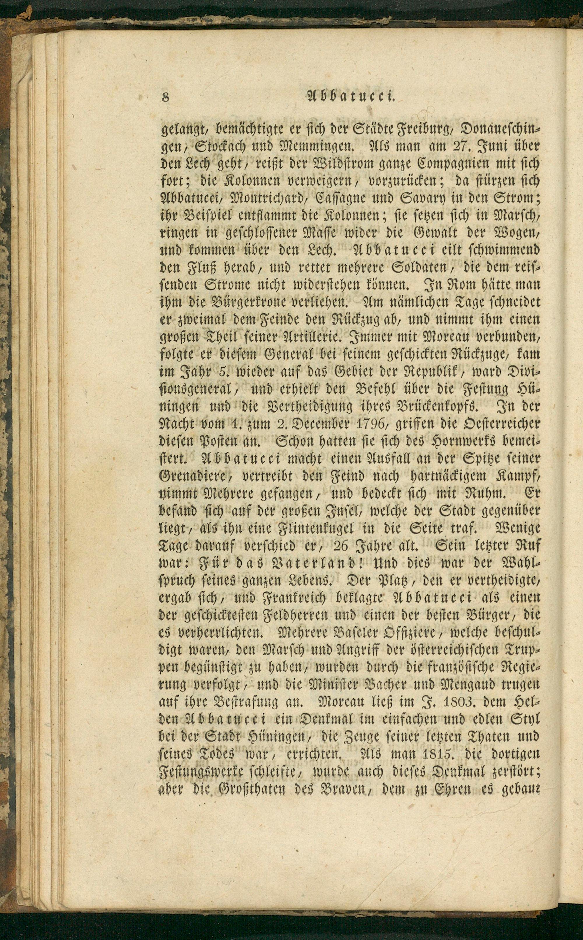 ihr Beiſpiel entflammt die Kolonnen; ſie ſetzen ſich in Marſch, ringen in geſchloſſener Maſſe wider die Gewalt der Wogen, und kommen über den Lech. Abbatucci eilt ſchwimmend den Fluß herab, und rettet mehrere Soldaten, die dem reiſ⸗ ſenden Strome nicht widerſtehen können. In Rom hätte man ihm die Bürgerkrone verliehen. Am nämlichen Tage ſchneidet er zweimal dem Feinde den Rückzug ab, und nimmt ihm einen großen Theil ſeiner Artillerie. Immer mit Moreau verbunden, folgte er dieſem General bei ſeinem geſchickten Rückzuge, kam im Jahr 5. wieder auf das Gebiet der Republik, ward Divi⸗ ſtonsgeneral, und erhielt den Befehl über die Feſtung Hü⸗ ningen und die Vertheidigung ihres Brückenkopfs. In der Nacht vom 1. zum 2. December 1796, griffen die Oeſterreicher dieſen Poſten an. Schon hatten ſie ſich des Hornwerks bemei⸗ ſtert. Abbatucci macht einen Ausfall an der Spitze ſeiner Grenadiere, vertreibt den Feind nach hartnäckigem Kampf, nimmt Mehrere gefangen, und bedeckt ſich mit Ruhm. Er befand ſich auf der großen Inſel, welche der Stadt gegenüber liegt, als ihn eine Flintenkugel in die Seite traf. Wenige Tage darauf verſchied er, 26 Jahre alt. Sein letzter Ruf war: Für das Vaterland! Und dies war der Wahl⸗ ſpruch ſeines ganzen Lebens. Der Platz, den er vertheidigte, ergab ſich, und Frankreich beklagte Abbatucci als einen der geſchickteſten Feldherren und einen der beſten Bürger, die es verherrlichten. Mehrere Baſeler Offiziere, welche beſchul⸗ digt waren, den Marſch und Angriff der öſterreichiſchen Trup⸗ pen begünſtigt zu haben, wurden durch die franzöſiſche Regie⸗ rung verfolgt, und die Miniſter Bacher und Mengaud trugen auf ihre Beſtrafung an. Moreau ließ im J. 1803. dem Hel⸗ den Abbatucei ein Denkmal im einfachen und edlen Styl bei der Stadt Hüningen, die Zeuge ſeiner letzten Thaten und ſeines Todes war, errichten. Als man 1815. die dortigen Feſtungswerke ſchleifte, wurde auch dieſes Denkmal zerſtört; aber die Großthaten des Braven, dem zu Ehren es gebaut