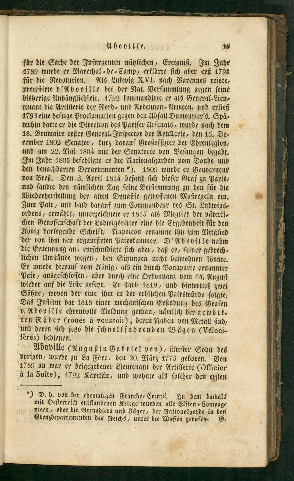 Aboville(Auguſtin Gabriel von), älteſter Sohn des vorigen, wurde zu La Foͤre, den 20. März 1773 geboren. Von 1789 an war er beigegebener Lieutenant der Artillerie(Officier