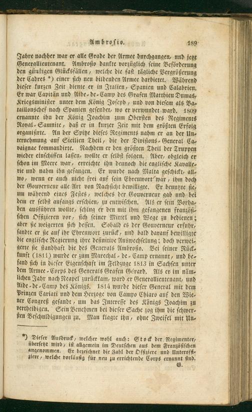 Jahre nachher war er alle Grade der Armee durchgangen, und jetzt Generallieutenant. Ambroſio dankte vorzüglich ſeine Beförderung den günſtigen Glücksfällen, welche die faſt tägliche Vergrößerung der Cadres*) einer ſich neu bildenden Armee darbietet. Während dieſer kurzen Zeit diente er in Italien, Spanien und Calabrien. Er war Capitän und Aide⸗de⸗Camp des Grafen Matthien Dumas, Kriegsminiſter unter dem König Joſeph, und von dieſem als Ba⸗ taillonschef nach Spanien geſendet, wo er verwundet ward. 1809 ernannte ihn der König Joachim zum Oberſten des Regiments Royal⸗Samnite, daß er in kurzer Zeit mit dem größten Erfolg organiſirte. An der Spitze dieſes Regiments nahm er an der Un⸗ ternehmung auf Sicilien Theil, die der Diviſions⸗General Ca⸗ vaignac kommandirte. Nachdem er den größten Theil der Truppen wieder einſchiffen laſſen, wollte er ſelbſt folgen. Aber, obgleich er ſchon im Meere war, erreichte ihn dennoch die engliſche Kavalle⸗ rie und nahm ihn gefangen. Er wurde nach Malta geſchickt, all⸗ wo, wenn er auch nicht frei auf ſein Ehrenwort war, ihm doch der Gouverneur alle Art von Nachſicht bewilligte. Er benutzte ſie, um während eines Feſtes, welches der Gouverneur gab und bei dem er ſelbſt anfangs erſchien, zu entwiſchen. Als er ſein Vorha⸗ ben ausführen wollte, ſchlug er den mit ihm gefangenen franzöſi⸗ ſchen Offizieren vor, ſich ſeiner Mittel und Wege zu bedienen; aber ſie weigerten ſich deſſen. Sobald es der Gouverneur erfuhr, ſandte er ſie auf ihr Ehrenwort zurück, und bald darauf bewilligte die engliſche Regierung ihre definitive Auswechſelung:; doch verwei⸗ gerte ſie ſtandhaft die des Generals Ambroſio. Bei ſeiner Rück⸗ kunft(1841) wurde er zum Marechal⸗ de⸗Camp ernannt, und be⸗ fand ſich in dieſer Eigenſchaft im Feldzuge 1813 in Sachſen unter dem Armee⸗Corps des Generals Grafen Gérard. Als er im näm⸗ lichen Jahr nach Neapel zurückkam, ward er Generallientenant, und Aide⸗de⸗Camp des Königs. 1814 wurde dieſer General mit dem Prinzen Cariati und dem Herzoge von Campo Chiaro auf den Wie⸗ ner Congreß geſandt, um das Intereſſe des Königs Joachim zu vertheidigen. Sein Benehmen bei dieſer Sache zog ihm die ſchwer⸗ ſten Beſchuldigungen zu. Man klagte ihn, ohne Zweifel mit Un⸗