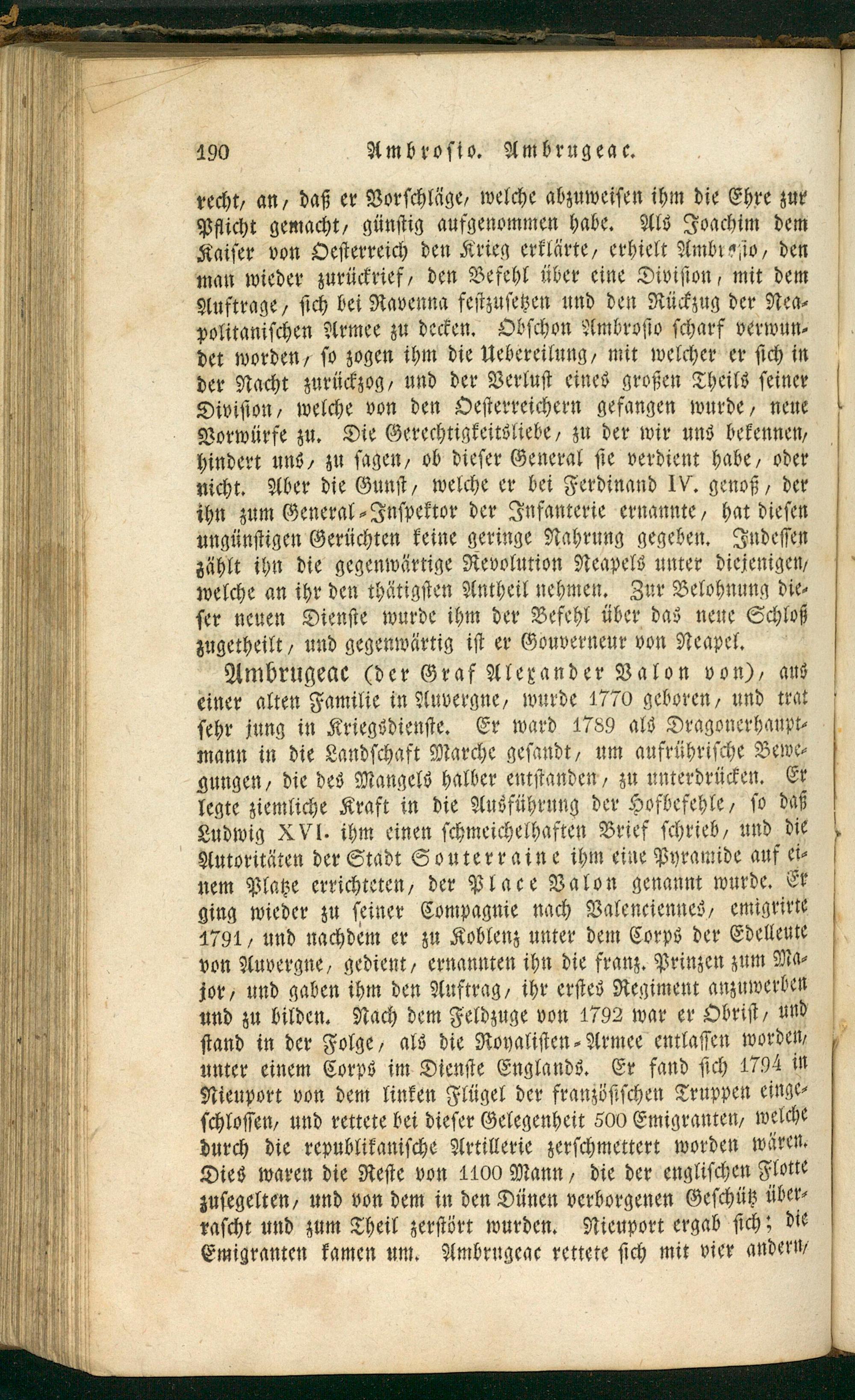recht, an, daß er Vorſchläge, welche abzuweiſen ihm die Ehre zur Pflicht gemacht, günſtig aufgenommen habe. Als Joachim dem Kaiſer von Oeſterreich den Krieg erklärte, erhielt Ambroſio, den man wieder zurückrief, den Befehl über eine Diviſion, mit dem Auftrage, ſich bei Ravenna feſtzuſetzen und den Rückzug der Nea⸗ politaniſchen Armee zu decken. Obſchon Ambroſio ſcharf verwun⸗ det worden, ſo zogen ihm die Uebereilung, mit welcher er ſich in der Nacht zurückzog, und der Verluſt eines großen Theils ſeiner Diviſton, welche von den Oeſterreichern gefangen wurde, neue Vorwürfe zu. Die Gerechtigkeitsliebe, zu der wir uns bekennen, hindert uns, zu ſagen, ob dieſer General ſie verdient habe, oder nicht. Aber die Gunſt, welche er bei Ferdinand IV. genoß, der ihn zum General⸗Inſpektor der Infanterie ernannte, hat dieſen ungünſtigen Gerüchten keine geringe Nahrung gegeben. Indeſſen zählt ihn die gegenwärtige Revolution Neapels unter diejenigen, welche an ihr den thätigſten Antheil nehmen. Zur Belohnung die⸗ ſer neuen Dienſte wurde ihm der Befehl über das neue Schloß zugetheilt, und gegenwärtig iſt er Gouverneur von Neapel. Ambrugeac(der Graf Alexander Valon von), aus einer alten Familie in Auvergne, wurde 1770 geboren, und trat ſehr jung in Kriegsdienſte. Er ward 1789 als Dragonerhaupt⸗ mann in die Landſchaft Marche geſandt, um aufrühriſche Bewe⸗ gungen, die des Mangels halber entſtanden, zu unterdrücken. Er legte ziemliche Kraft in die Ausführung der Hofbefehle, ſo daß Ludwig XVI. ihm einen ſchmeichelhaften Brief ſchrieb, und die Autoritäten der Stadt Souterraine ihm eine Pyramide auf ei⸗ nem Platze errichteten, der Place Valon genannt wurde. Er ging wieder zu ſeiner Compagnie nach Valenciennes, emigrirte 1791, und nachdem er zu Koblenz unter dem Corps der Edelleute von Auvergne, gedient, ernannten ihn die franz. Prinzen zum Ma⸗ jor, und gaben ihm den Auftrag, ihr erſtes Regiment anzuwerben und zu bilden. Nach dem Feldzuge von 1792 war er Obriſt, und ſtand in der Folge, als die Royaliſten⸗Armee entlaſſen worden unter einem Corps im Dienſte Englands. Er fand ſich 1794 in Nieuport von dem linken Flügel der franzöſiſchen Truppen einge⸗ ſchloſſen, und rettete bei dieſer Gelegenheit 500 Emigranten, welche durch die republikaniſche Artillerie zerſchmettert worden wären. Dies waren die Reſte von 1100 Mann, die der engliſchen Flotte zuſegelten, und von dem in den Dünen verborgenen Geſchütz über⸗ raſcht und zum Theil zerſtört wurden. Nieuport ergab ſich; die Emigranten kamen um. Ambrugeac rettete ſich mit vier andern,