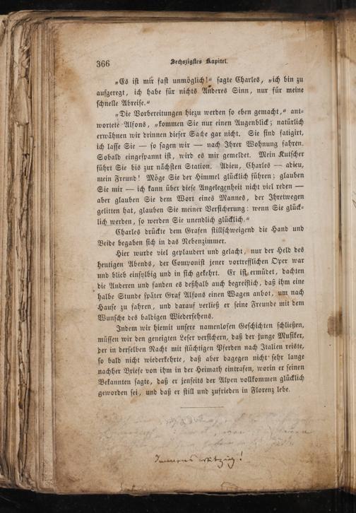 Indem wir hiemit unſere namenloſen Geſchichten ſchließen, müſſen wir den geneigten Leſer verſichern, daß der junge Muſiker, der in derſelben Nacht mit flüchtigen Pferden nach Italien reiste, ſo bald nicht wiederkehrte, daß aber dagegen nicht ſehr lange nachher Briefe von ihm in der Heimath eintrafen, worin er ſeinen Bekannten ſagte, daß er jenſeits der Alpen vollkommen glücklich geworden ſei, und daß er ſtill und zufrieden in Florenz lebe.