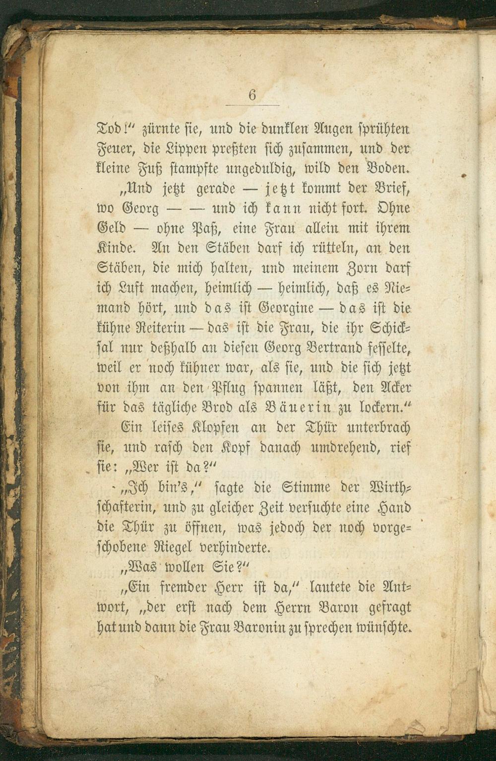 „Und jetzt gerade— jetzt kommt der Brief, wo Georg—— und ich kann nicht fort. Ohne Geld— ohne Paß, eine Frau allein mit ihrem Kinde. An den Stäben darf ich rütteln, an den Stäben, die mich halten, und meinem Zorn darf ich Luft machen, heimlich— heimlich, daß es Nie⸗ mand hört, und das iſt Georgine— das iſt die kühne Reiterin— das iſt die Frau, die ihr Schick⸗ ſal nur deßhalb an dieſen Georg Bertrand feſſelte, weil er noch kühner war, als ſie, und die ſich jetzt von ihm an den Pflug ſpannen läßt, den Acker für das tägliche Brod als Bäuerin zu lockern.“ Ein leiſes Klopfen an der Thür unterbrach ſie, und raſch den Kopf danach umdrehend, rief ſie:„Wer iſt da?“.