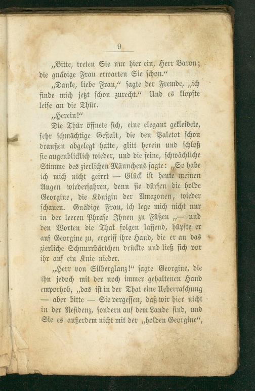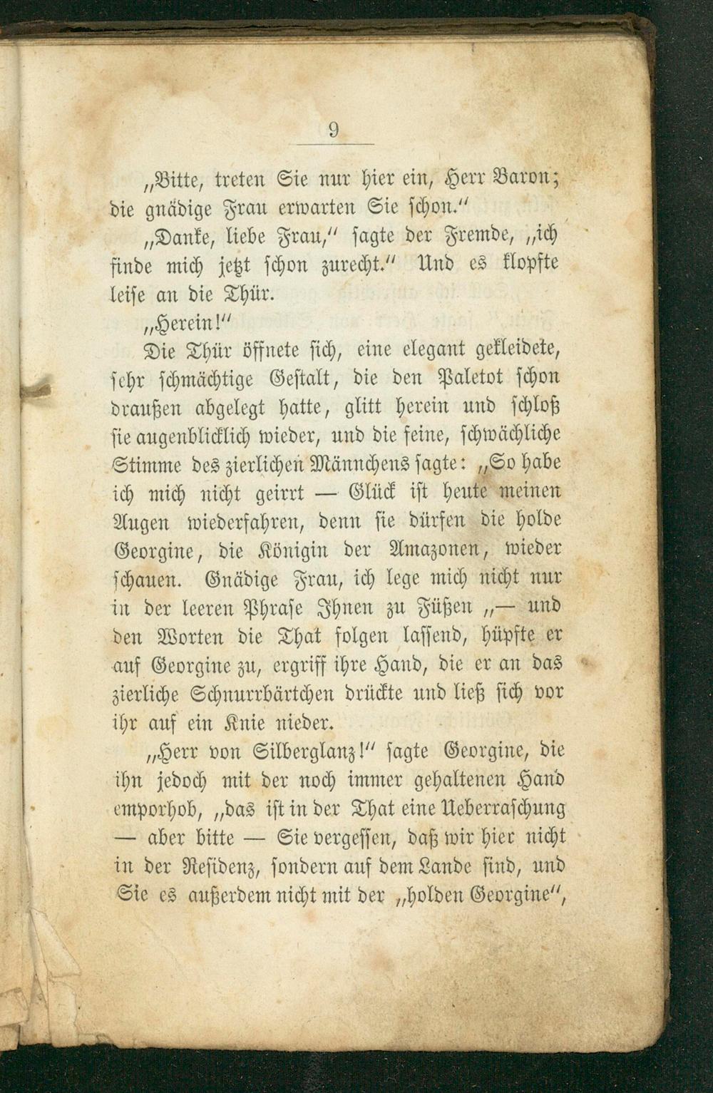 „Herr von Silberglanz!“ ſagte Georgine, die ihn jedoch mit der noch immer gehaltenen Hand emporhob,„das iſt in der That eine Ueberraſchung — aber bitte— Sie vergeſſen, daß wir hier nicht in der Reſidenz, ſondern auf dem Lande ſind, und Sie es außerdem nicht mit der„holden Georgine“,