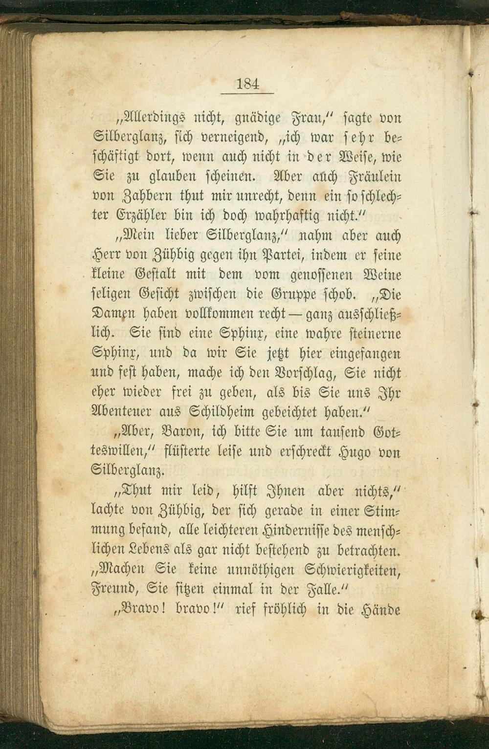 „Mein lieber Silberglanz,“ nahm aber auch Herr von Zühbig gegen ihn Partei, indem er ſeine kleine Geſtalt mit dem vom genoſſenen Weine ſeligen Geſicht zwiſchen die Gruppe ſchob.„Die Damen haben vollkommen recht— ganz ausſchließ⸗ lich. Sie ſind eine Sphinx, eine wahre ſteinerne Sphinx, und da wir Sie jetzt hier eingefangen und feſt haben, mache ich den Vorſchlag, Sie nicht eher wieder frei zu geben, als bis Sie uns Ihr Abenteuer aus Schildheim gebeichtet haben.“