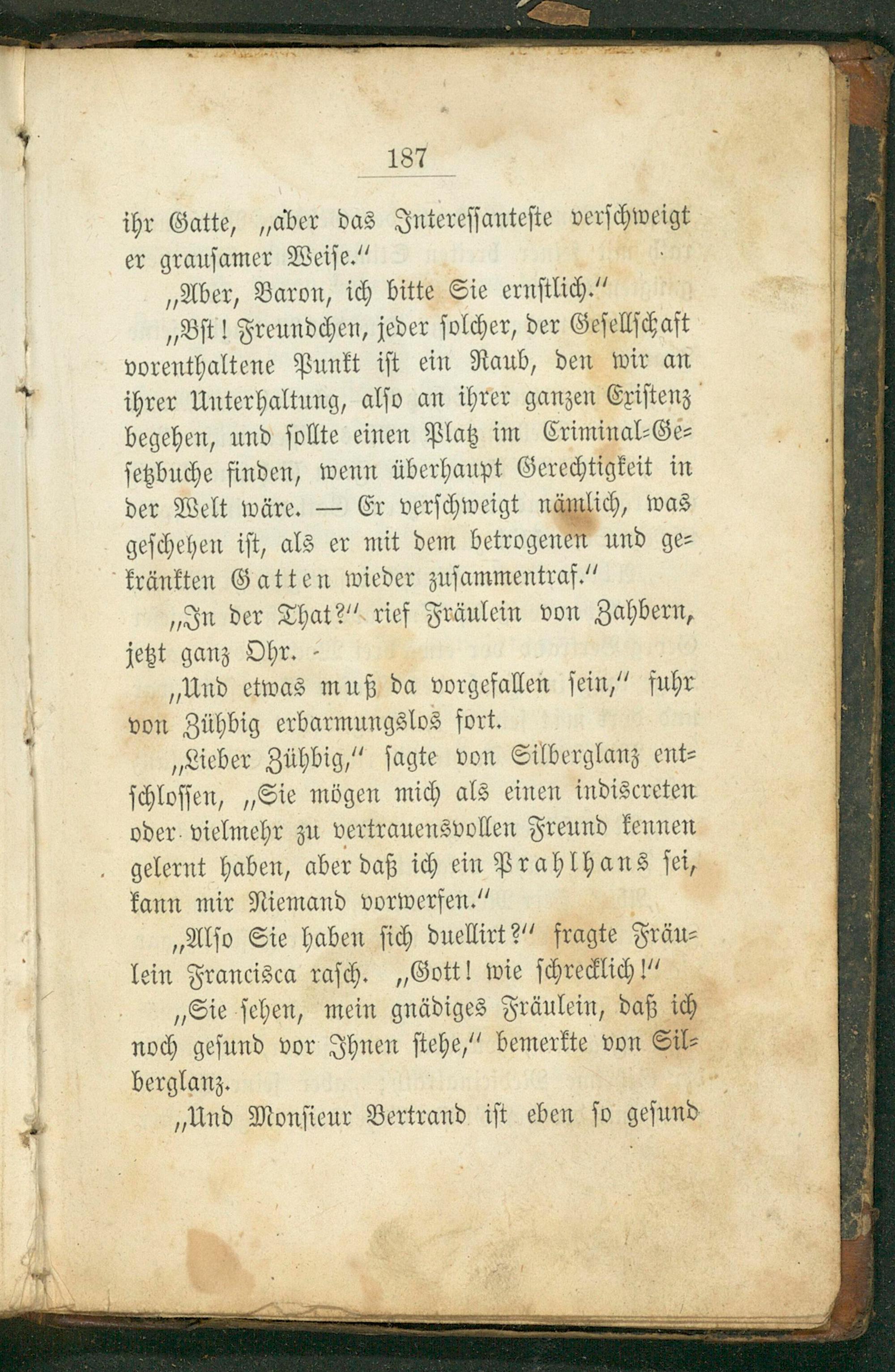 „Bſt! Freundchen, jeder ſolcher, der Geſellſchaft vorenthaltene Punkt iſt ein Raub, den wir an ihrer Unterhaltung, alſo an ihrer ganzen Exiſtenz begehen, und ſollte einen Platz im Criminal⸗Ge⸗ ſetzbuche finden, wenn überhaupt Gerechtigkeit in der Welt wäre.— Er verſchweigt nämlich, was geſchehen iſt, als er mit dem betrogenen und ge⸗ kränkten Gatten wieder zuſammentraf.“