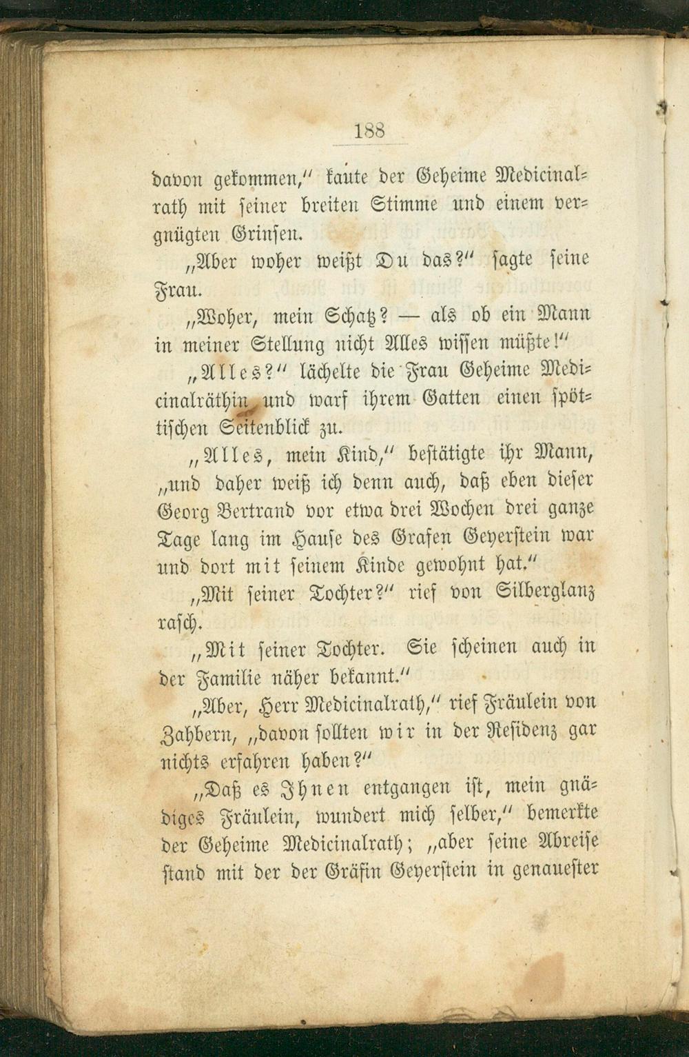„Alles, mein Kind,“ beſtätigte ihr Mann, „und daher weiß ich denn auch, daß eben dieſer Georg Bertrand vor etwa drei Wochen drei ganze Tage lang im Hauſe des Grafen Geyerſtein war und dort mit ſeinem Kinde gewohnt hat.“