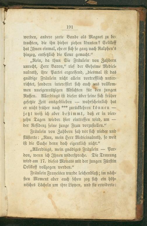 „Nein, da thun Sie Fräulein von Zahbern unrecht, Herr Baron,“ rief der Geheime Medici⸗ nalrath, ihre Partei ergreifend,„diesmal iſt das gnädige Fräulein nicht allein vortrefflich unter⸗ richtet, ſondern intereſſirt ſich auch aus vollkom⸗ men uneigennützigen Abſichten für den jungen Ruſſen. Allerdings iſt dieſer über ſeine ſich früher geſetzte Zeit ausgeblieben— wahrſcheinlich hat er nicht früher nach*es zurückkehren können— jetzt weiß ich aber beſtimmt, daß er in vier⸗ zehn Tagen wieder hier eintreffen wird, um— der Reſidenz ſeine junge Frau vorzuſtellen.“