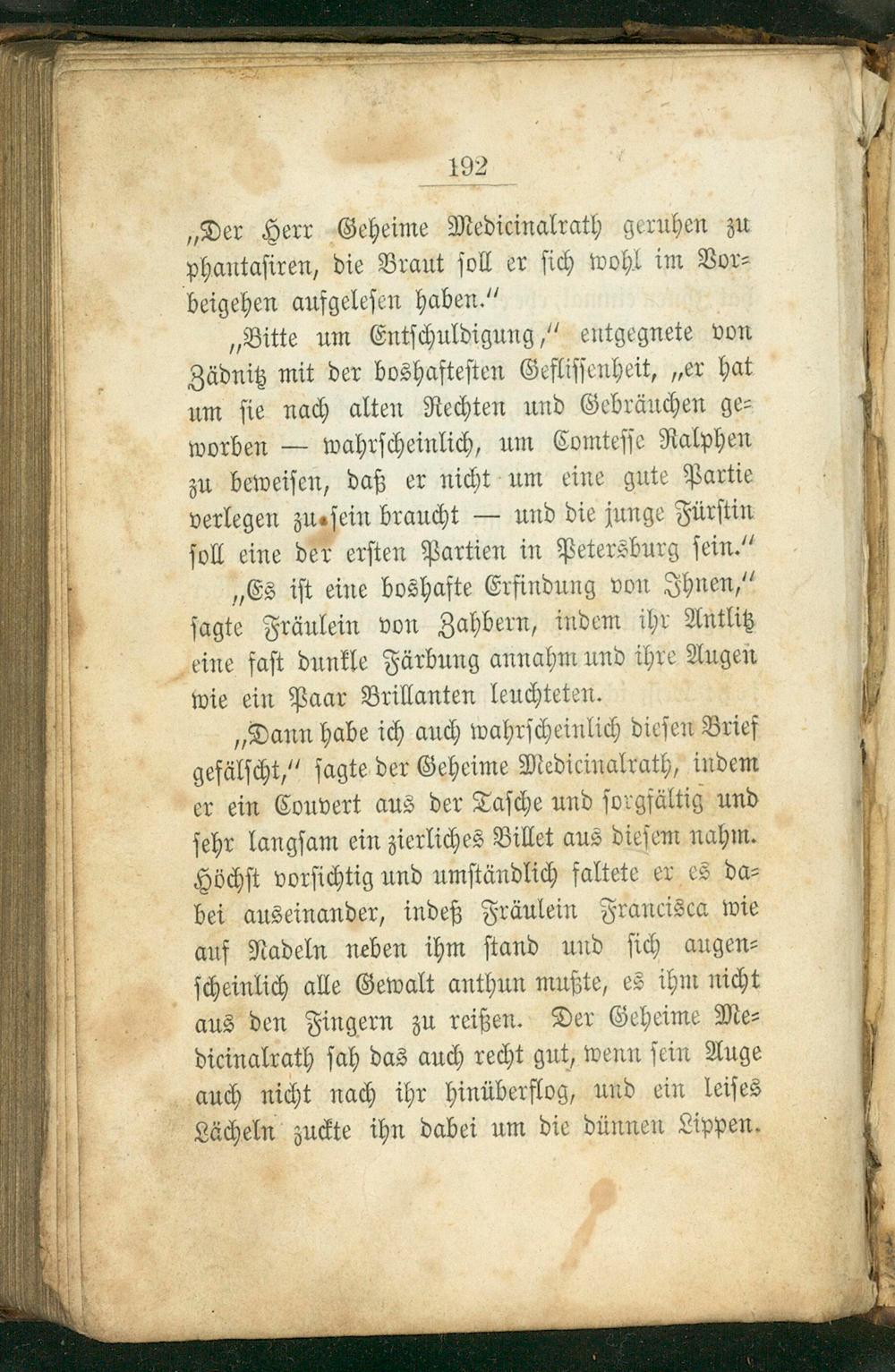„Dann habe ich auch wahrſcheinlich dieſen Brief gefälſcht,“ ſagte der Geheime Medicinalrath, indem er ein Couvert aus der Taſche und ſorgfältig und ſehr langſam ein zierliches Billet aus dieſem nahm. Höchſt vorſichtig und umſtändlich faltete er es da⸗ bei auseinander, indeß Fräulein Francisca wie auf Nadeln neben ihm ſtand und ſich augen⸗ ſcheinlich alle Gewalt anthun mußte, es ihm nicht aus den Fingern zu reißen. Der Geheime Me⸗ dicinalrath ſah das auch recht gut, wenn ſein Auge
