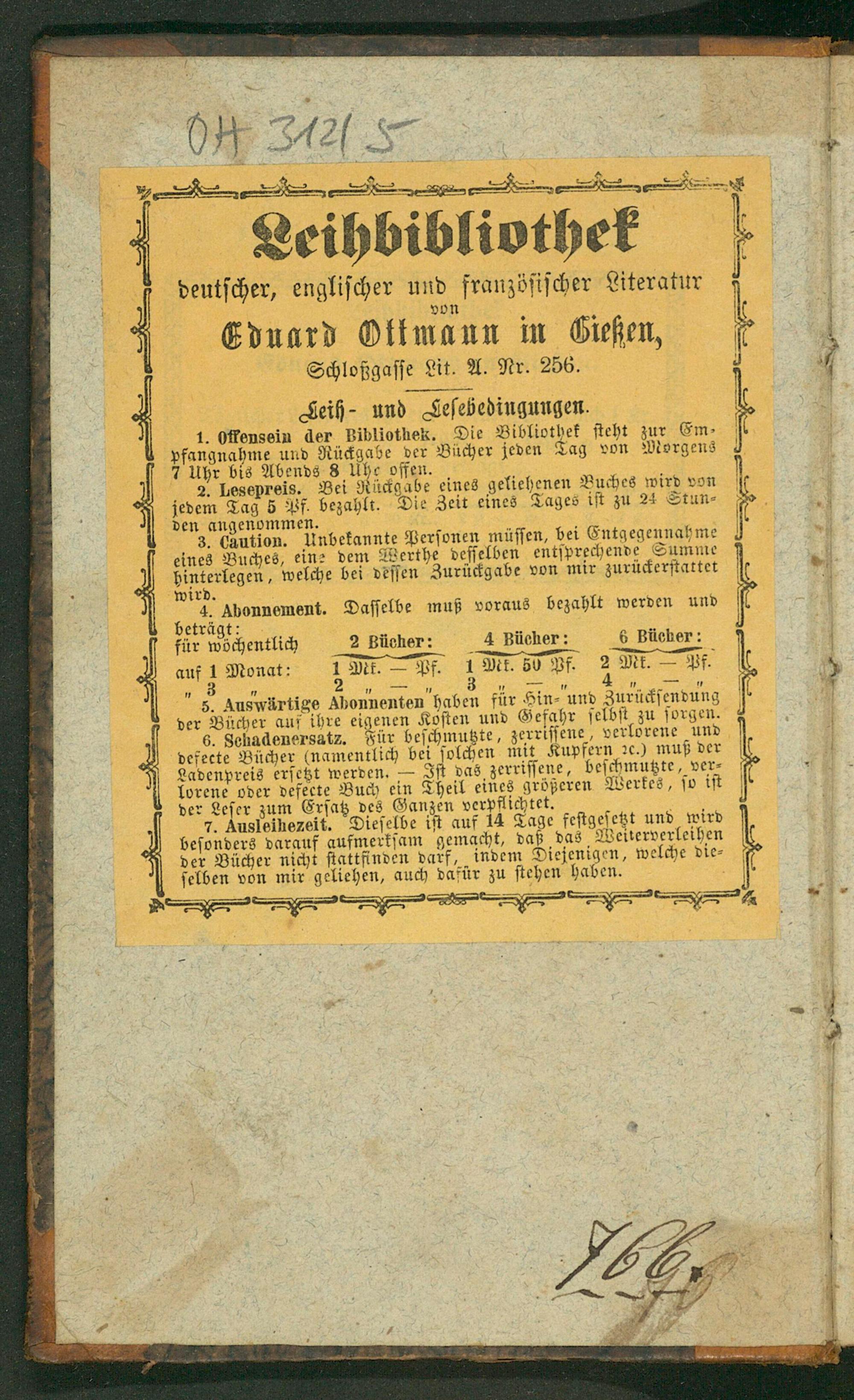 7. Ausleihezeit. Dieſelbe iſt auf 14 Tage feſtgeſetzt und wird beſonders darauf aufmerkſam gemacht, daß das Weiterverleihen der Bücher nicht ſtattfinden darf, indem Diejenigen, welche die⸗ ſelben von mir geliehen, auch dafür zu ſtehen haben. 3