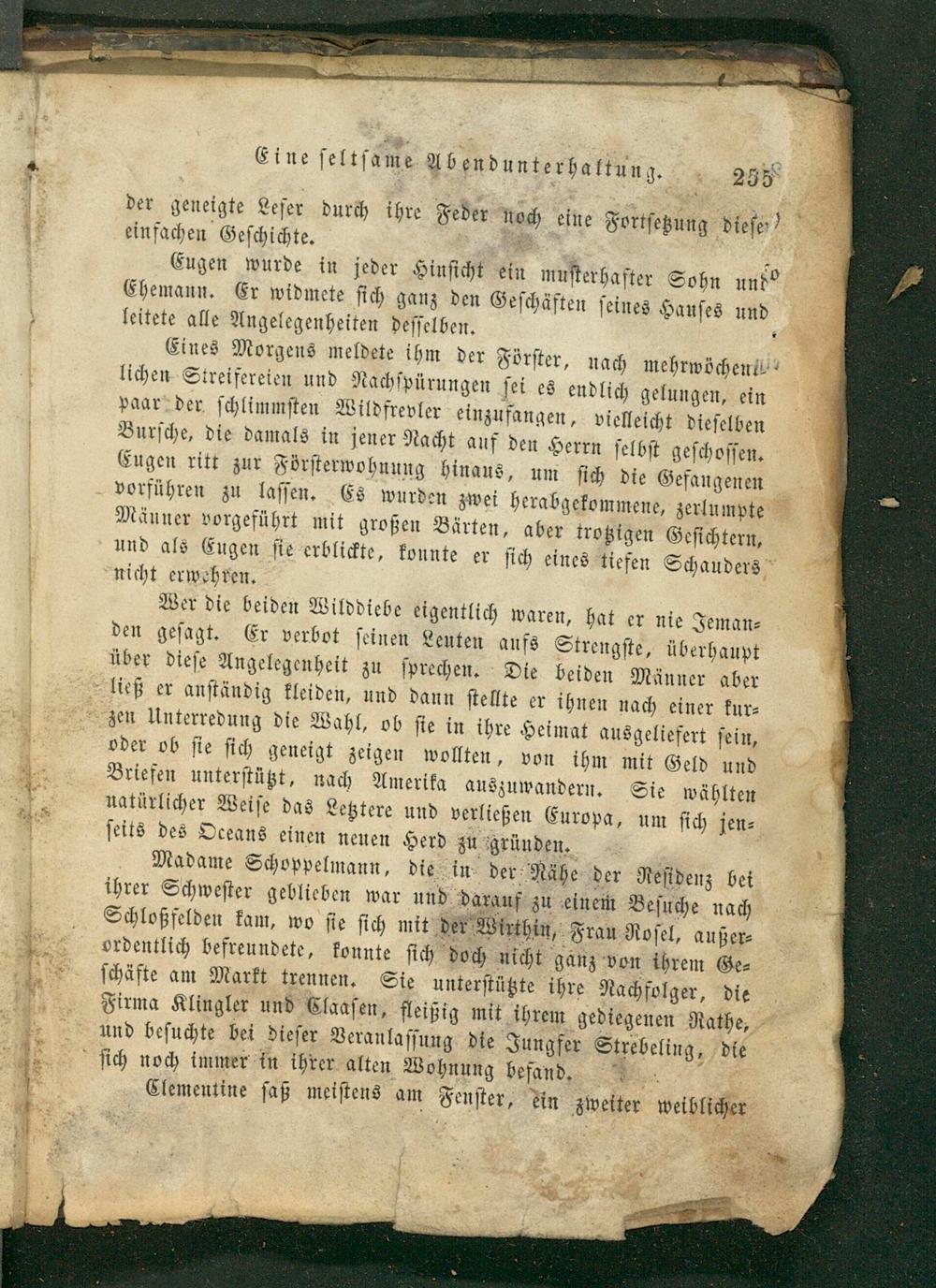 Madame Schoppelmann, die in der Nähe der Reſidenz bei ihrer Schweſter geblieben war und darauf zu einem Beſuche nach Schloßfelden kam, wo ſie ſich mit der Wirthin, Frau Roſel, außer⸗ ordentlich befreundete, konnte ſich doch nicht ganz von ihrem Ge⸗ ſchäfte am Markt trennen. Sie unterſtützte ihre Nachfolger, die Firma Klingler und Claaſen, fleißig mit ihrem gediegenen Rathe, und beſuchte bei dieſer Veranlaſſung die Jungfer Strebeling, die ſich noch immer in ihrer alten Wohnung befand.