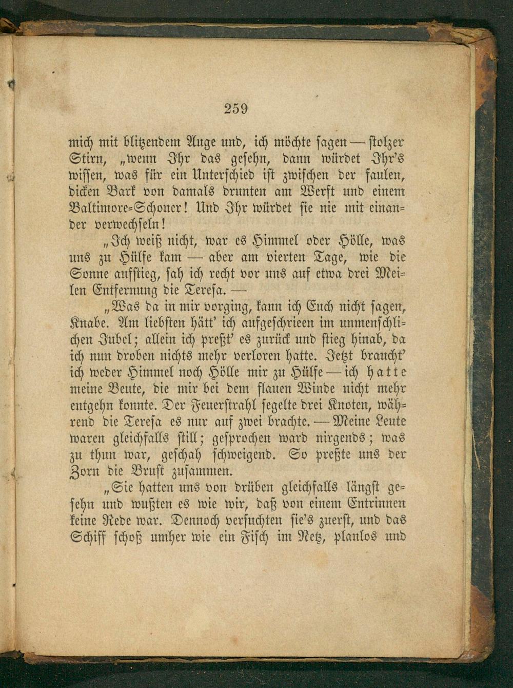 „Was da in mir vorging, kann ich Euch nicht ſagen, Knabe. Am liebſten hätt' ich aufgeſchrieen im unmenſchli⸗ chen Jubel; allein ich preßt' es zurück und ſtieg hinab, da ich nun droben nichts mehr verloren hatte. Jetzt braucht' ich weder Himmel noch Hölle mir zu Hülfe— ich hatte meine Beute, die mir bei dem flauen Winde nicht mehr entgehn konnte. Der Feuerſtrahl ſegelte drei Knoten, wäh⸗ rend die Tereſa es nur auf zwei brachte.— Meine Leute waren gleichfalls ſtill; geſprochen ward nirgends; was zu thun war, geſchah ſchweigend. So preßte uns der Zorn die Bruſt zuſammen.