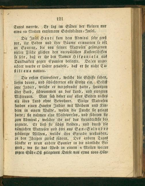 Die erſten Einwohner, welche die Schiffe ſahen, liefen davon, und ſchuͤchterten alle uͤbrige ein. Selbſt jene Indier, welche er mitgebracht hatte, ſprangen uͤber Bord, ſchwammen an das Land, und erregten Mißtrauen. Man ſah daher auf allen Seiten nichts als oͤdes Land ohne Bewohner. Einige Matroſen fanden einen Haufen Indier mit Weibern und Kin⸗ dern in einem Walde, wohin die Furcht ſie gejagt hatte; ſie nahmen eine Weibsperſon, und fuͤhrten ſie zum Admiral, welcher ihr auf das freundlichſte be⸗ gegnete. Er ließ ſie ſchoͤn kleiden, und durch die naͤmlichen Matroſen und drei aus San⸗Salvador gebuͤrtige Wilden, welche ihre Sprache verſtanden, zu den Ihrigen zuruͤck fuͤhren. Des andern Tages ſchickte er neun andere Spanier in die naͤmliche Ge⸗ gend, wo ſie das Weib in einem 4 Meilen weiter gegen Suͤd⸗Oſt gelegenen Dorfe von etwa 1000 Hüt⸗