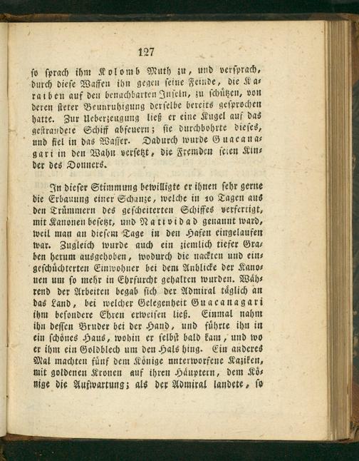 In dieſer Stimmung bewilligte er ihnen ſehr gerne die Erbauung einer Schanze, welche in 10 Tagen aus den Truͤmmern des geſcheiterten Schiffes verfertigt, mit Kanonen beſetzt, und Natividad genannt ward, weil man an dieſem Tage in den Hafen eingelaufen war. Zugleich wurde auch ein ziemlich tiefer Gra⸗ ben herum ausgehoben, wodurch die nackten und ein⸗ geſchuͤchterten Einwohner bei dem Anblicke der Kano⸗ nen um ſo mehr in Ehrfurcht gehalten wurden. Waͤh⸗ rend der Arbeiten begab ſich der Admiral taͤglich an das Land, bei welcher Gelegenheit Guacanagari ihm beſondere Ehren erweiſen ließ. Einmal nahm ihn deſſen Bruder bei der Hand, und fuͤhrte ihn in ein ſchoͤnes Haus, wohin er ſelbſt bald kam, und wo er ihm ein Goldblech um den Hals hing. Ein anderes Mal machten fuͤnf dem Koͤnige unterworfene Kaziken, mit goldenen Kronen auf ihren Haͤuptern, dem Koͤ⸗ nige die Aufwartung; als der Admiral landete, ſo
