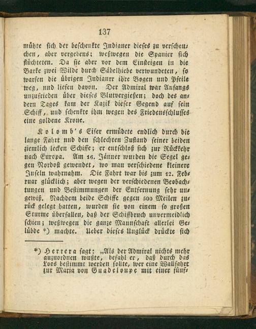 Kolomb's Eifer ermuͤdete endlich durch die lange Fahrt und den ſchlechten Zuſtand ſeiner beiden ziemlich lecken Schiffe; er entſchloß ſich zur Ruͤckkehr nach Europa. Am 16. Jaͤnner wurden die Segel ge⸗ gen Nordoſt gewendet, wo man verſchiedene kleinere Inſeln wahrnahm. Die Fahrt war bis zum 12. Feb⸗ ruar gluͤcklich; aber wegen der verſchiedenen Beobach⸗ tungen und Beſtimmungen der Entfernung ſehr un⸗ gewiß. Nachdem beide Schiffe gegen soo Meilen zu⸗ ruͤck gelegt hatten, wurden ſie von einem ſo großen Sturme uͤberfallen, daß der Schiffbruch unvermeidlich ſchien; weßwegen die ganze Mannſchaft allerlei Ge⸗ luͤbde*) machte. Ueber dieſes Ungluͤck druͤckte ſich