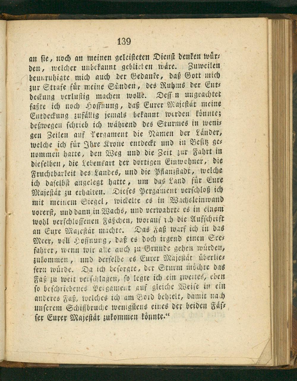 an ſie, noch an meinen geleiſteten Dienſt denken wuͤr⸗ den, welcher unbekannt geblieben waͤre. Zuweilen beunruhigte mich auch der Gedanke, daß Gott mich zur Strafe fuͤr meine Suͤnden, des Ruhms der Ent⸗ derkung verluſtig machen wolle. Deſſen ungeachtet faßte ich noch Hoffnung, daß Eurer Majeſtaͤt meine Entdeckung zufaͤllig jemals bekannt werden koͤnnte; deßwegen ſchrieb ich waͤhrend des Sturmes in weni⸗ gen Zeilen auf Pergament die Namen der Laͤnder, welche ich fuͤr Ihre Krone entdeckt und in Beſitz ge⸗ nommen hatte, den Weg und die Zeit zur Fahrt in dieſelben, die Lebensart der dortigen Einwohner, die Fruchtbarkeit des Landes, und die Pflanzſtadt, welche ich daſelbſt angelegt hatte, um das Land fuͤr Eure Majeſtaͤt zu erhalten. Dieſes Pergament verſchloß ich mit meinem Siegel, wickelte es in Wachsleinwand vorerſt, und dann in Wachs, und verwahrte es in einem wohl verſchloſſenen Faͤßchen, worauf ch die Aufſchrift an Eure Majeſtaͤt machte. Das Faß warf ich in das Meer, voll Hoffnung, daß es doch irgend einen See⸗ fahrer, wenn wir alle auch zu Grunde gehen wuͤrden, zukommen, und derſelbe es Eurer Majeſtaͤt uͤberlie⸗ fern wuͤrde. Da ich beſorgte, der Sturm moͤchte das Faß zu weit verſchlagen, ſo legte ich ein zweites, eben ſo beſchriebenes Pergament auf gleiche Weiſe in ein anderes Faß, welches ich am Bord behlelt, damit nach unſerem Schiffbruche wenigſtens eines der beiden Faͤſ⸗ ſer Eurer Majeſtaͤt zukommen koͤnnte.“