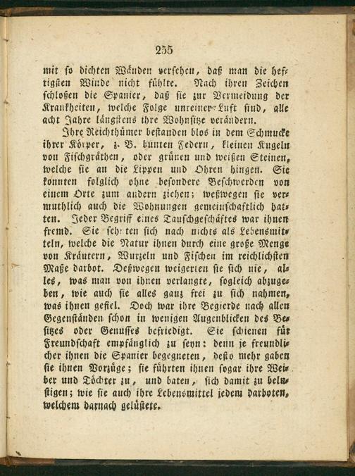 von Fiſchgraͤthen, oder gruͤnen und weißen Steinen, welche ſie an die Lippen und Ohren hingen. Sie konnten folglich ohne beſondere Beſchwerden von einem Orte zum andern ziehen; weßwegen ſie ver⸗ muthlich auch die Wohnungen gemeinſchaftlich hat⸗ ten. Jeder Begriff eines Tauſchgeſchaͤftes war ihnen fremd. Sie ſehnten ſich nach nichts als Lebensmit⸗ teln, welche die Natur ihnen durch eine große Menge von Kraͤutern, Wurzeln und Fiſchen im reichlichſten Maße darbot. Deßwegen weigerten ſie ſich nie, al⸗ les, was man von ihnen verlangte, ſogleich abzuge⸗ ben, wie auch ſie alles ganz frei zu ſich nahmen, was ihnen gefiel. Doch war ihre Begierde nach allen Gegenſtaͤnden ſchon in wenigen Augenblicken des Be⸗ ſitzes oder Genuſſes befriedigt. Sie ſchienen fuͤr Freundſchaft empfaͤnglich zu ſeyn: denn je freundli⸗ cher ihnen die Spanier begegneten, deſto mehr gaben