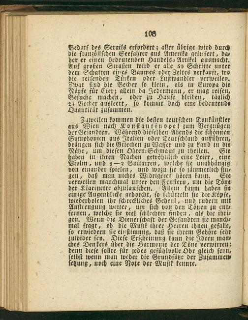 Zuweilen kommen die beſten teutſchen Tonkuͤnſtler aus Wien nach Konſtantinopel zum Vergnuͤgen der Geſandten. Waͤhrend dieſelben Abends die ſchoͤnſten Symphonien aus Italien oder Teutſchland auffuͤhren, draͤngen ſich die Griechen zu Waſfer und zu Land in die Naͤhe, um dieſen Ohren⸗Schmaus zu theilen. Sie haben in ihren Nachen Hewahen 95 eine Leier, eine Biolin, und 1— 2 Guitarren, welche ſie unabhaͤngig von einander ſpielen, und wozu ſie ſo jaͤmmerlich ſin⸗ gen, daß man nichts Widrigeres hoͤren kann. Sie verweilen manchmal unter den Fenſtern, um die Toͤne der Klarinette abzulauſchen. Allein kaum haben ſie einige Augenblicke gehorcht, ſo ſchuͤtteln ſie die Koͤpfe, wiederholen ihr ſchreckliches Gehenl, und rudern mit Anſtrengung weiter, um ſich von den Toͤnen zu ent⸗ fernen, welche ſie viel ſchlechter finden, als die ihri⸗ gen. Wenn die Dienerſchaft der Geſandten ſie manch⸗ mal fragt, ob die Muſik ihrer Ferfen thnen gefalle, ſo erwiedern ſie einſtimmig, daß ſie ihrem Gehoͤre ſehr zuwider ſey. Dieſe Erſcheinung kann die Ideen man⸗ ches Den kers uͤber die Harmonie der Toͤne verwirren: denn dieſe ſollte fuͤr jedes gefuͤhlvolle Ohr gleich ſeyn, ſelbſt wenn man weder die Grundſaͤtze der Zuſammen⸗ ſetzung, noch eine Note der Muſik kennte.