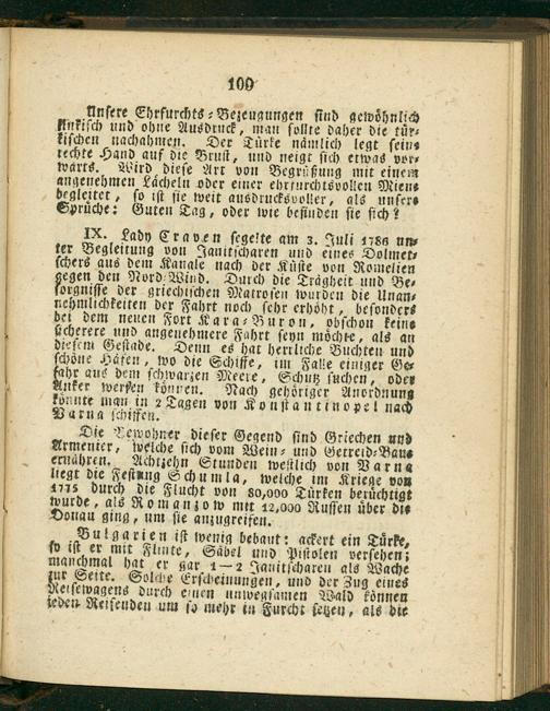 IX. Lady Craven ſegelte am 3. Juli 1786 un⸗ ter Begleitung von Janitſcharen und eines Dolmet⸗ ſchers aus dem Kangle nach der Kuüͤſte von Romelien ſegen den Nord⸗Wind. Durch die Traͤgheit und Be⸗ orgniſſe der griechiſchen Matroſen wurden die Unan⸗ nehmlichkeiten der Fahrt noch ſehr erhoͤht, beſonders bei dem neuen Fort Kara⸗Buron, obſchon keine ücherere und angenehmere Fahrt ſeyn moͤchte, als an dieſem Geſtade. Denn es hat herrliche Buchten und ſchöne Haͤfen, wo die Schiffe, im Falle einiger Ge⸗