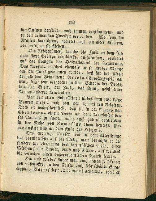 Die Reichthuͤmer, welche die Inſel in dem In⸗ nern ihrer Gebirge verſchließt, aufzuſuchen, verbietet auf das ſtrengſte der Despotismus der Regierung. Das Kupfer, welches ehemals in ſo großer Menge auf der Inſel gewonnen wurde, daß ihr die Alten deßhalb den Beinamen: Beroſa.(Kupfer⸗Inſel) ga⸗ ben, liegt jetzt vergebens in dem Schooſe der Berge, wie das Eiſen, der Zink, das Zinn, nebſt einer Menge anderer Mineralien.—