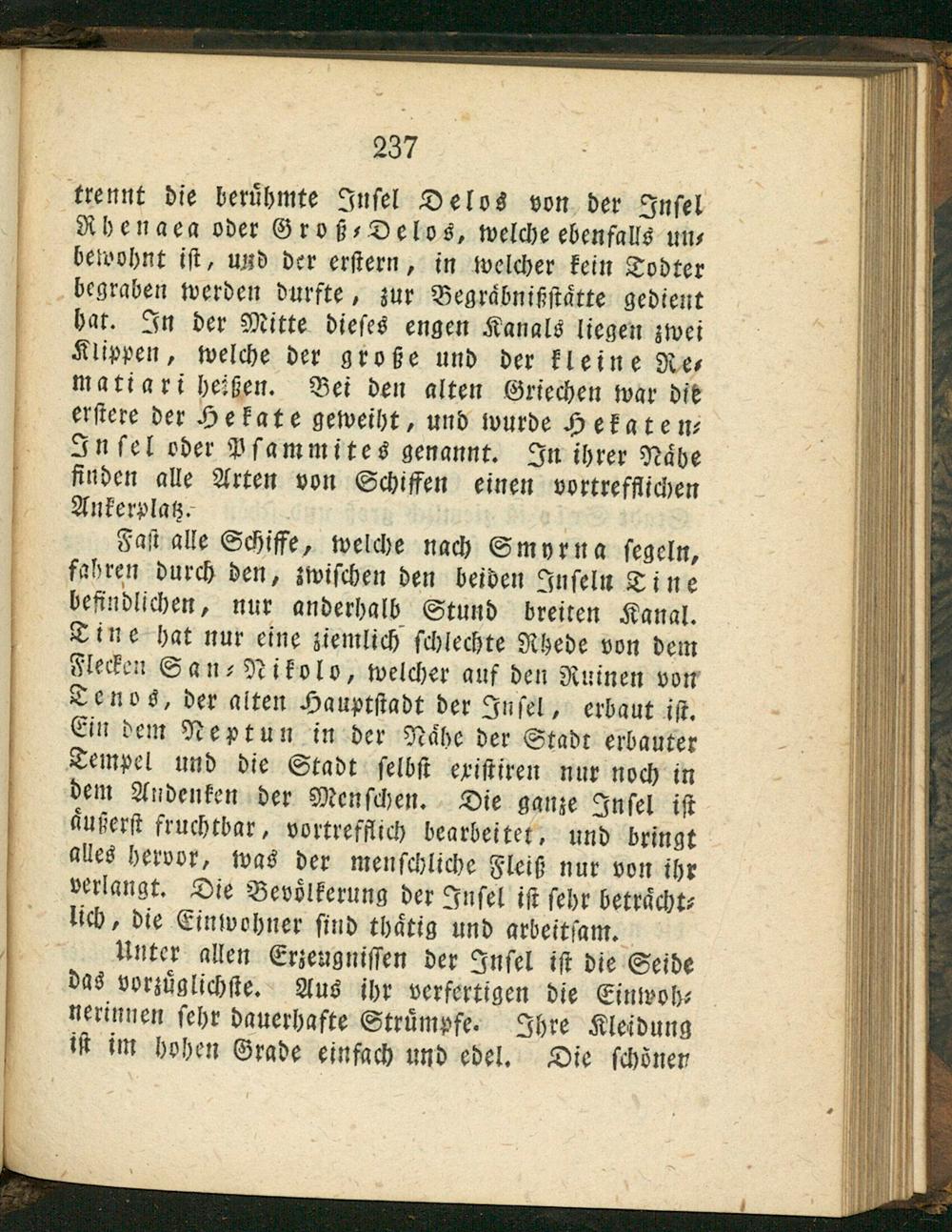 Faſt alle Schiffe, welche nach Smyrna ſegeln, fahren durch den, zwiſchen den beiden Inſeln Tine befindlichen, nur anderhalb Stund breiten Kanal. Tine hat nur eine ziemlich ſchlechte Rhede von dem Flecken San⸗Nikolo, welcher auf den Ruinen von Tenos, der alten Hauptſtadt der Inſel, erbaut iſt. Ein dem Neptun in der Naͤhe der Stadt erbauter Tempel und die Stadt ſelbſt exiſtiren nur noch in dem Andenken der Menſchen. Die ganze Inſel iſt aͤußerſt fruchtbar, vortrefflich bearbeitet, und bringt alles hervor, was der menſchliche Fleiß nur von ihr verlangt. Die Bevoͤlkerung der Inſel iſt ſehr betraͤcht⸗ lich, die Einwohner ſind thaͤtig und arbeitſam.