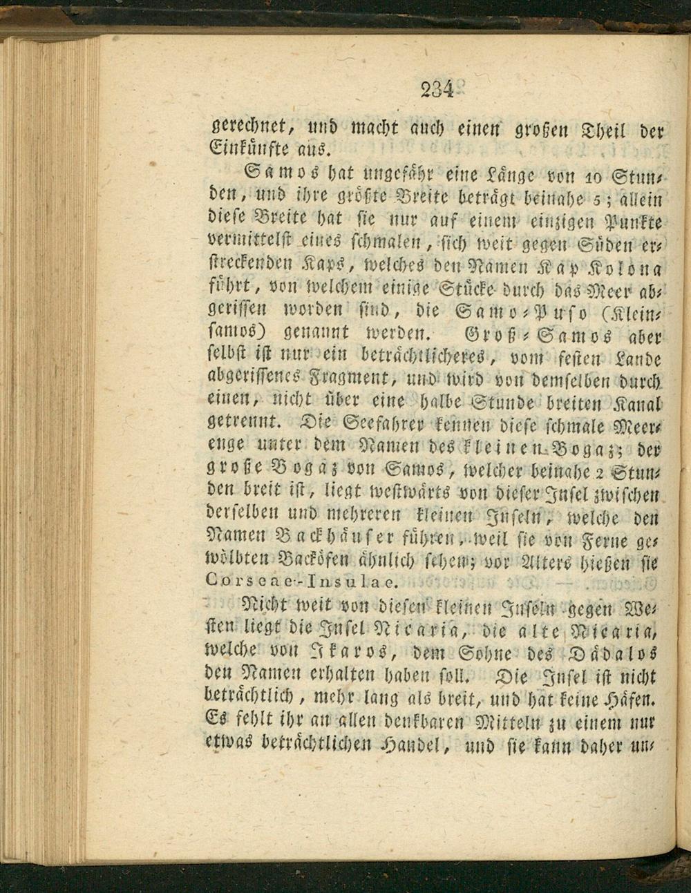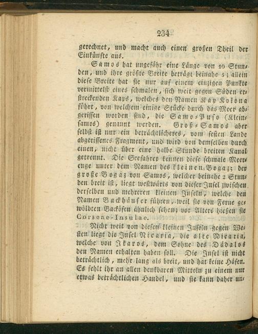Samos hat ungefaͤhr eine Laͤnge von 10 Stun⸗ den, und ihre groͤßte Breite betraͤgt beinahe s; allein dieſe Breite hat ſie nur auf einem einzigen Punkte vermittelſt eines ſchmalen, ſich weit gegen Suͤden er⸗ ſtreckenden Kaps, welches den Namen Kap Kolona fuͤhrt, von welchem einige Stuͤcke durch das Meer ab⸗ geriſſen worden ſind, die Samo⸗Puſo(Klein⸗ ſamvs) genannt werden. Groß⸗Samos aber ſelbſt iſt nur ein betraͤchtlicheres, vom feſten Lande abgeriſſenes Fragment, und wird von demſelben durch einen, nicht uͤber eine halbe Stunde breiten Kanal getrennt. Die Seefahrer kennen dieſe ſchmale Meer⸗ enge unter dem Namen des kleinen⸗Bogaz; der große Bogaz von Samos, welcher beinahe 2 Stun⸗ den breit iſt, liegt weſtwaͤrts von dieſer Inſel zwiſchen derſelben und mehreren kleinen Inſeln, welche den