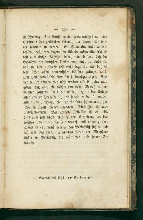 iſt ſchwierig. Die Kunſt wartet gewiſſermaßen auf eine Erfüllung des politiſchen Lebens, um daran ſelbſt wie⸗ der lebendig zu werden. Es iſt nämlich nicht zu ver⸗ hehlen, daß jener jugendliche Glaube neben aller Schief⸗ heit auch einige Wahrheit habe, nämlich die, daß die Geſchichte des deutſchen Volkes noch nicht zu Ende iſt, daß ſie hier vielmehr erſt recht beginnt, und daß es ſehr ſicher allen germaniſchen Völkern gelingen wird, zum Selbſtbewußtſein über ſich hindurchzudringen. Kin⸗ der freilich können dies nicht machen und Einzelne nicht geben, daß aber ein ſolcher zum hellen Bewußtſein er⸗ wachter Zuſtand ſich bilden müſſe, liegt in der Anlage aller unſerer Verhältniſſe, und ſobald er da iſt, werden Kunſt und Religion, die jetzt ebenfalls ſchlummern, zur ſchönſten Kraft wieder erwachen. Dieſe Zeit iſt nabe herbeigekommen. Das goldene Zeitalter iſt es nicht, denn auch jetzt ſchon fehlt es dem Einzelnen, der des Geiſtes und ſeiner Freiheit bedarf, mit nichten; aber ſchöner iſt es, wenn mehrere das Bedürfniß fühlen und ſich ihm überlaſſen. Glückliches Leben der Menſchen⸗ kinder im Bedürfniß des Göttlichen und ſeiner Er— füllung!