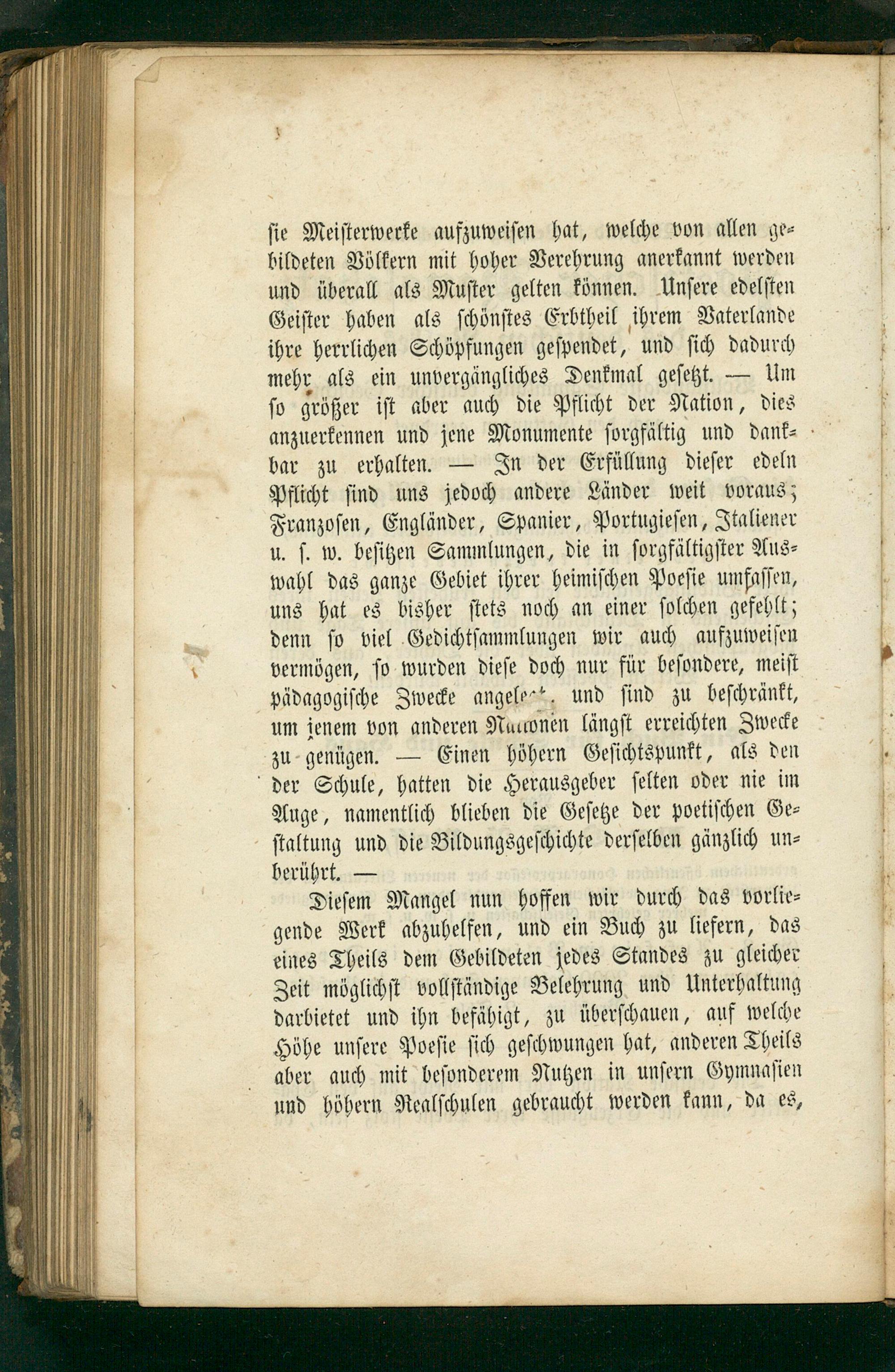 bar zu erhalten.— In der Erfüllung dieſer edeln Pflicht ſind uns jedoch andere Länder weit voraus; Franzoſen, Engländer, Spanier, Portugieſen, Italiener u. ſ. w. beſizen Sammlungen, die in ſorgfältigſter Aus⸗ wahl das ganze Gebiet ihrer heimiſchen Poeſie umfaſſen, uns hat es bisher ſtets noch an einer ſolchen gefehlt; denn ſo viel Gedichtſammlungen wir auch aufzuweiſen vermögen, ſo wurden dieſe doch nur für beſondere, meiſt pädagogiſche Zwecke angele⸗“ und ſind zu beſchränkt, um jenem von anderen Nuuwnen längſt erreichten Zwecke zu genügen.— Einen höhern Geſichtspunkt, als den der Schule, hatten die Herausgeber ſelten oder nie im Auge, namentlich blieben die Geſetze der poetiſchen Ge⸗ ſtaltung und die Bildungsgeſchichte derſelben gänzlich un⸗ berührt.—
