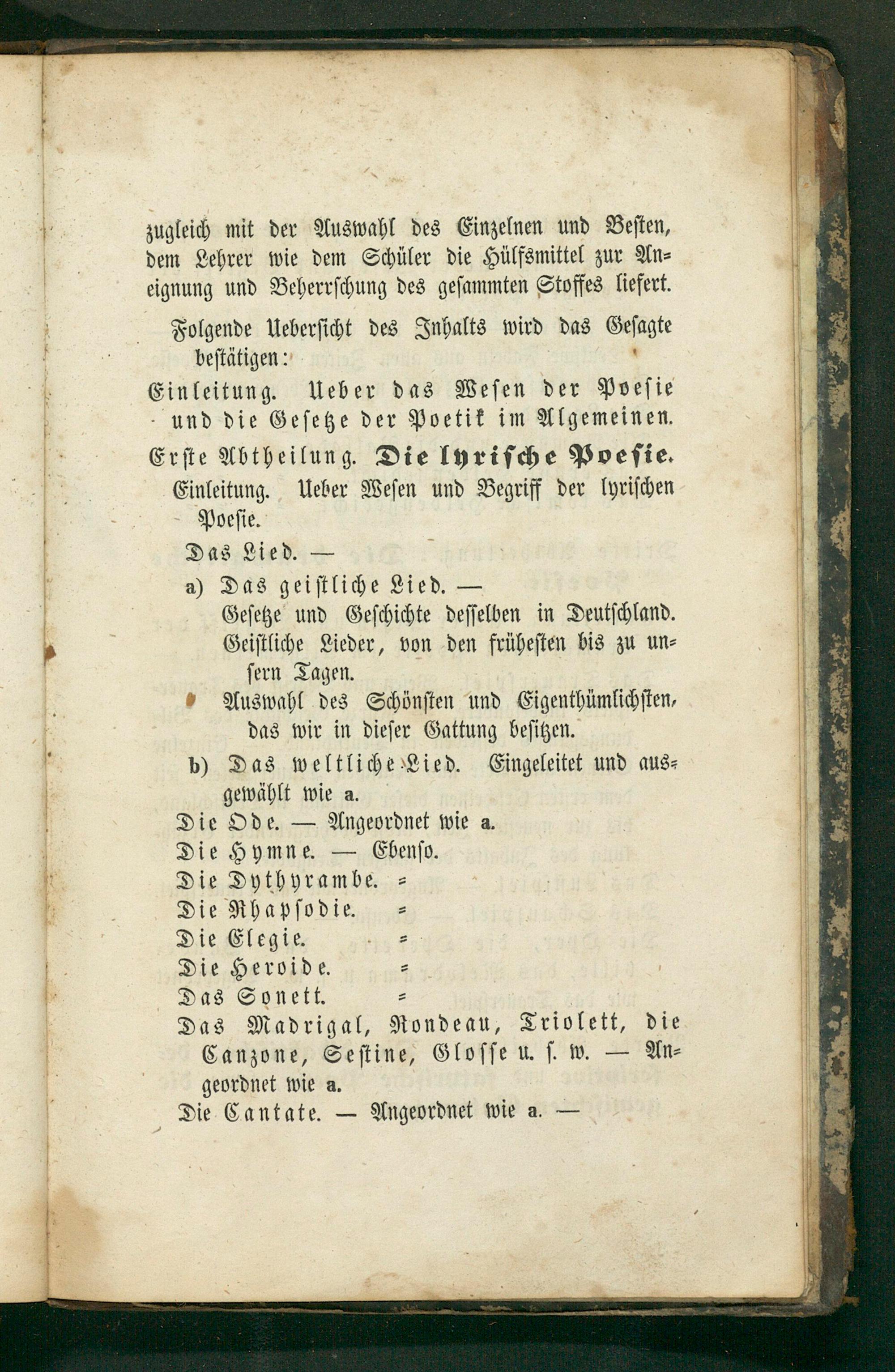 Folgende Ueberſicht des Inhalts wird das Geſagte beſtätigen: Einleitung. Ueber das Veſen der Poeſie und die Geſetze der Poetik im Algemeinen. Erſte Abtheilung. Die lyriſche Pveſie. Einleitung. Ueber Weſen und Begriff der lyriſchen Poeſie. Das Lied.— a) Das geiſtliche Lied.— Geſetze und Geſchichte deſſelben in Deutſchland. Geiſtliche Lieder, von den früheſten bis zu un⸗ ſern Tagen. „ Auswahl des Schönſten und Eigenthümlichſten⸗ das wir in dieſer Gattung beſitzen. b) Das weltliche Lied. Eingeleitet und aus⸗ gewählt wie a. Die Ode.— Angeordnet wie a. Die Hymne.— Ekbenſv. Die Dythyrambe. Die Rhapſodie. Die Elegie. Die Hervide. Das Sonett. Das Madrigal, Rondeau, Triolett, die Canzone, Seſtine, Gloſſe u. ſ. w.— An⸗ geordnet wie a. Die Cantate.— Angeordnet wie a.—