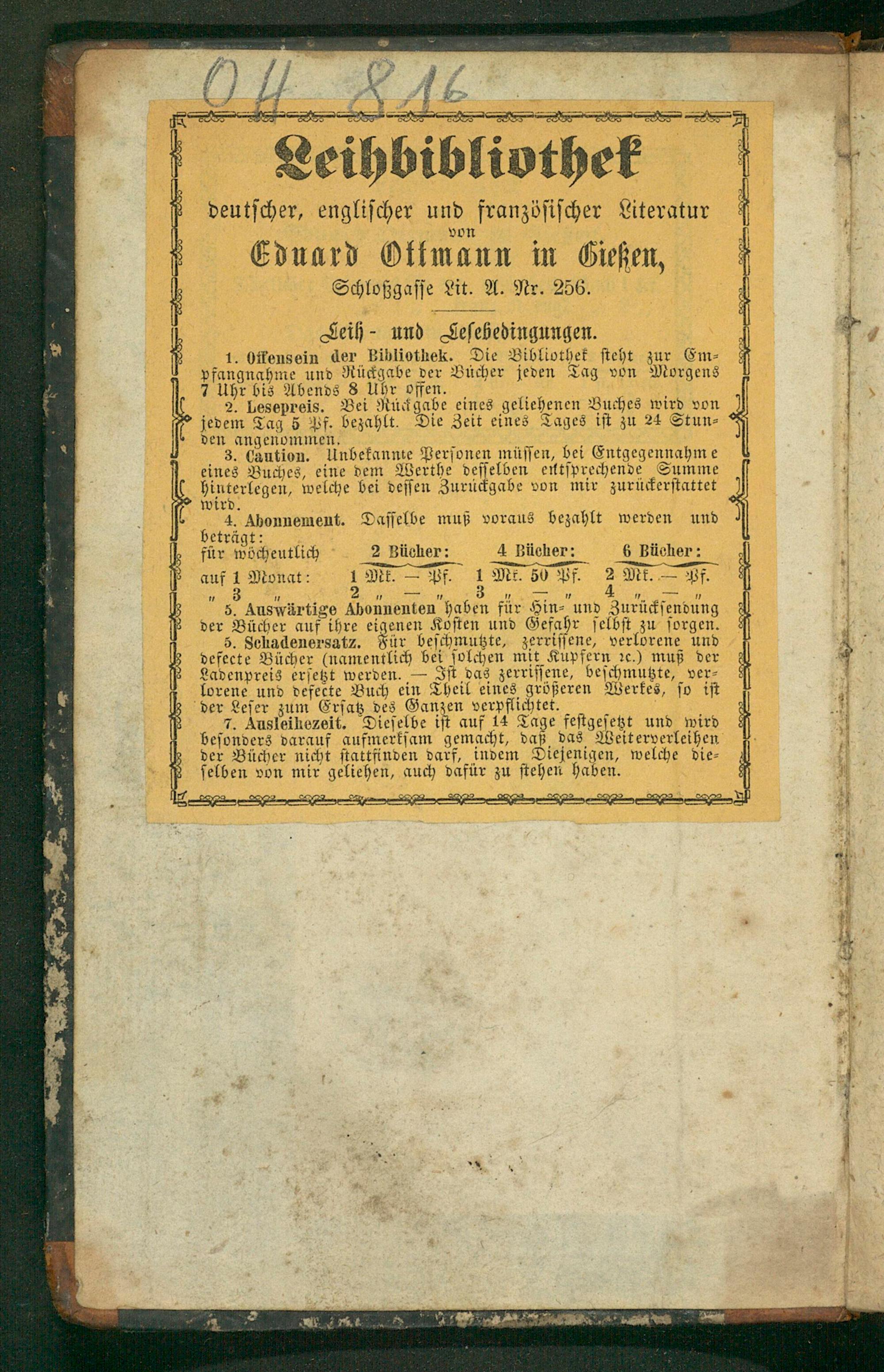 3. Caution. Unbekannte Perſonen müſſen, bei Entgegennahme eines Buches, eine dem Werthe beſie entſprechende Summe hinterkegen, welche bei deſſen Zurückgabe von mir zurückerſtattet wird.