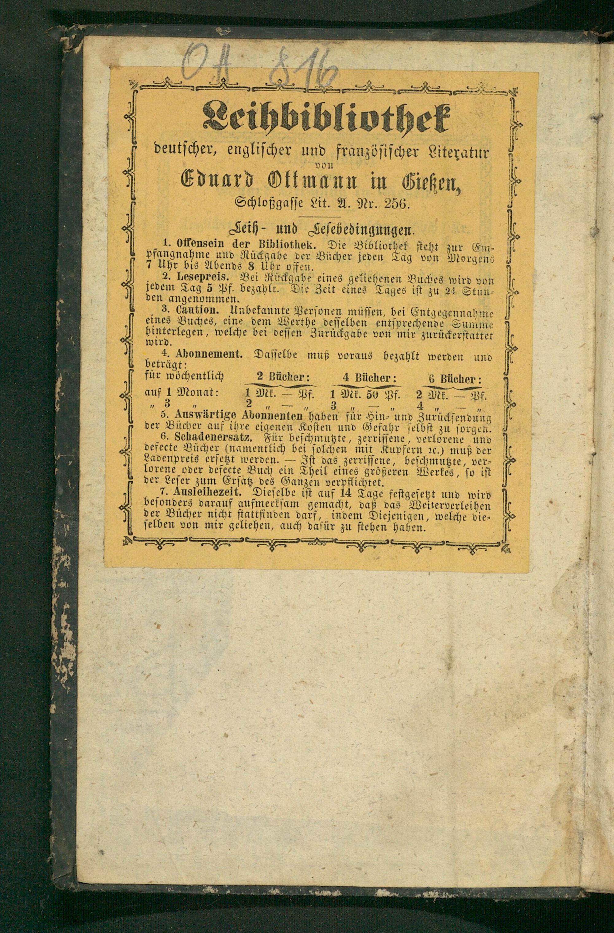 ſ. 2 † 4 Schloßgaſſe Lit. A. Nr. 256. 3 Seiß und Keſebedingungen. 4 „1. Oflensein der Bibliotheu. Die Bibliothek ſteht zur pfangnahme und Rückgabe der Bücher jeden Tag von Mor 2 7 Uhr bis Abends 8 Uhr offen ſ 2. Lesepreis. Bei Rückg eines geliehenen Buches wird von jedem Tag 5 Pf bezahlt. Zeit eines Tages iſt zu 24 Stun⸗ 5 den angenommen. 3. Qäution. Unbekannte Perſonen müſſen, bei Entgegennah: