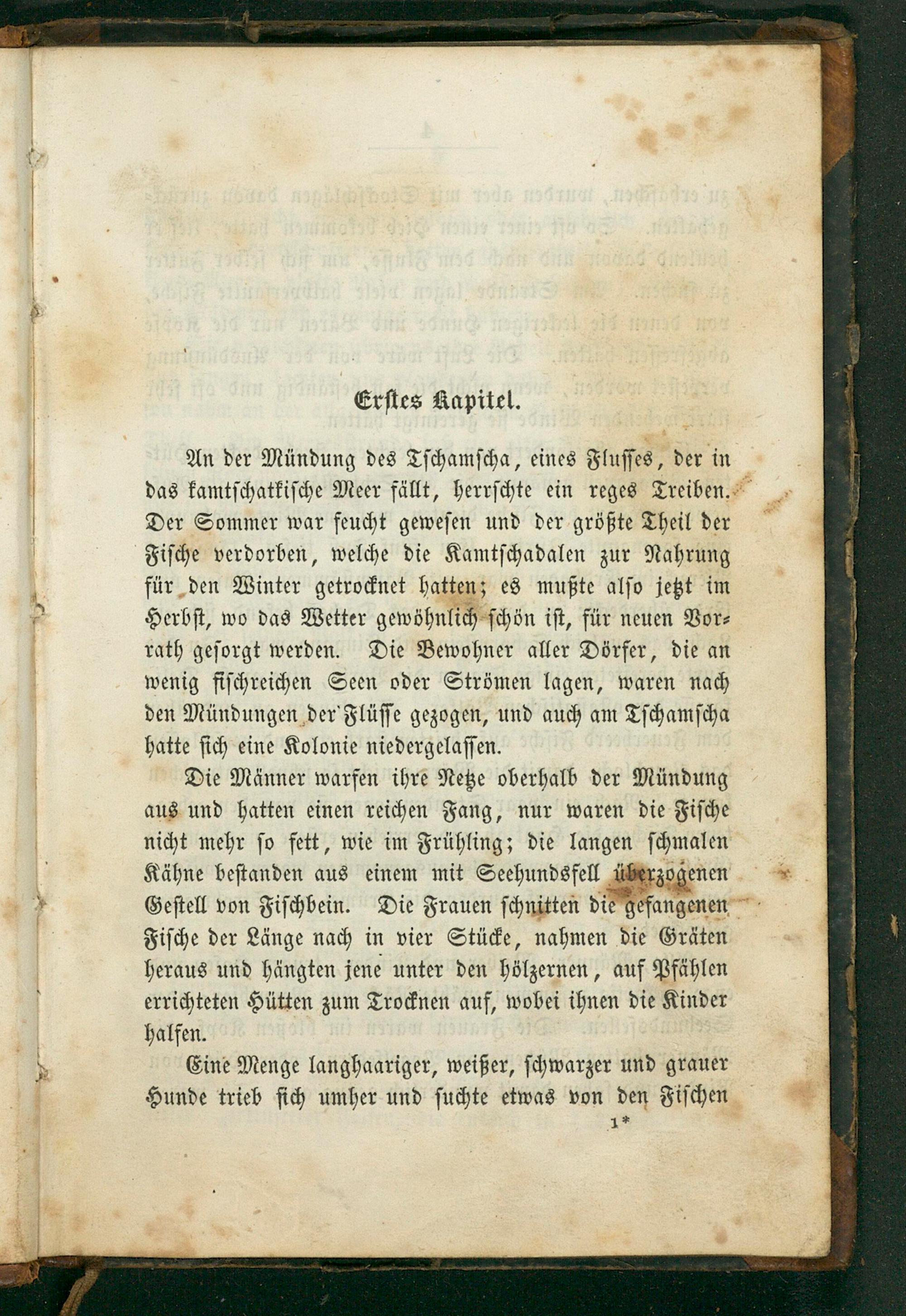 An der Mündung des Tſchamſcha, eines Fluſſes, der in das kamtſchatkiſche Meer fällt, herrſchte ein reges Treiben. Der Sommer war feucht geweſen und der größte Theil der Fiſche verdorben, welche die Kamtſchadalen zur Nahrung für den Winter pehoüne hatten; es mußte alſo jetzt im Herbſt, wo das Wetter gewöhnlich ſchön iſt, für neuen Vor⸗ rath geſorgt werden. Die Bewohner aller Dörfer, die an wenig fiſchreichen Seen oder Strömen lagen, waren nach den Mündungen der Flüſſe gezogen, und auch am Tſchamſcha hatte ſich eine Kolonie niedergelaſſen.