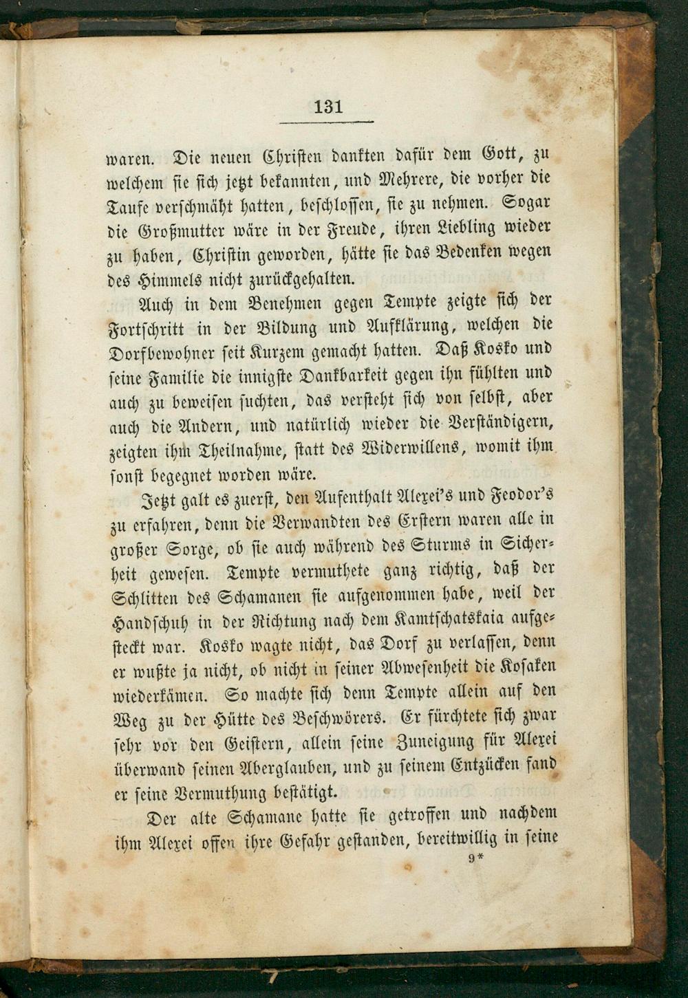 Jetzt galt es zuerſt, den Aufenthalt Alexei's und Feodor's zu erfahren, denn die Verwandten des Erſtern waren alle in großer Sorge, ob ſie auch während des Sturms in Sicher⸗ heit geweſen. Tempte vermuthete ganz richtig, daß der Schlitten des Schamanen ſie aufgenommen habe, weil der Handſchuh in der Richtung nach dem Kamtſchatskaia aufge⸗ ſteckt war. Kosko wagte nicht, das Dorf zu verlaſſen, denn er wußte ja nicht, ob nicht in ſeiner Abweſenheit die Koſaken wiederkämen. So machte ſich denn Tempte allein auf den Weg zu der Hütte des Beſchwörers. Er fürchtete ſich zwar ſehr vor den Geiſtern, allein ſeine Zuneigung für Alexei überwand ſeinen Aberglauben, und zu ſeinem Entzücken fand er ſeine Vermuthung beſtätigt.