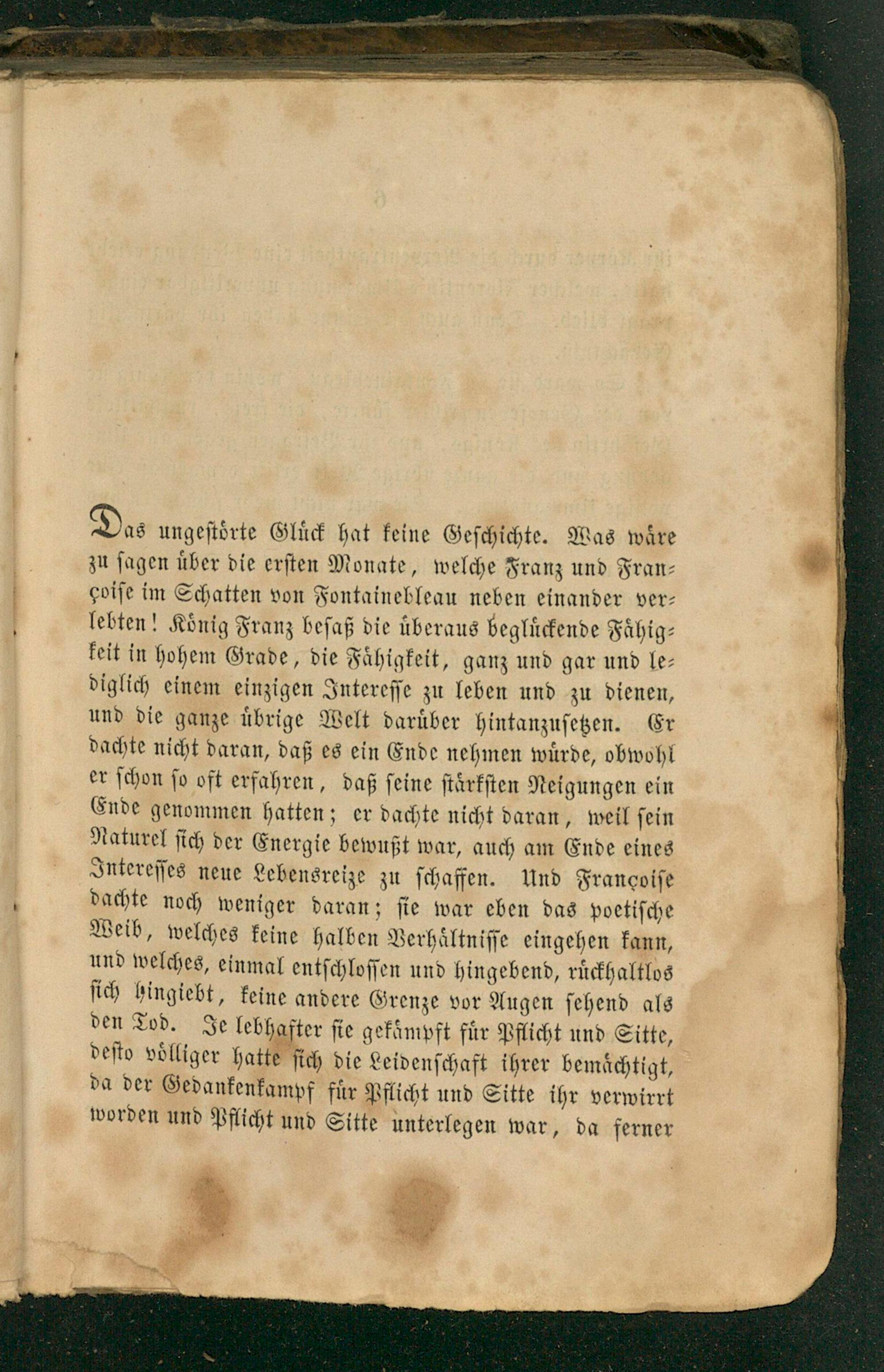 Das ungeſtoͤrte Gluͤck hat keine Geſchichte. Was waͤre zu ſagen uͤber die erſten Monate, welche Franz und Fran⸗ goiſe im Schatten von Fontainebleau neben einander ver⸗ lebten! Koͤnig Franz beſaß die überaus begluͤckende Faͤhig⸗ keit in hohem Grade, die Faͤhigkeit, ganz und gar und le⸗ diglich einem einzigen Intereſſe zu leben und zu dienen, und die ganze uͤbrige Welt daruͤber hintanzuſetzen. Er dachte nicht daran, daß es ein Ende nehmen würde, obwohl er ſchon ſo oft erfahren, daß ſeine ſtaͤrkſten Neigungen ein Ende genommen hatten; er dachte nicht daran, weil ſein Naturel ſich der Energie bewußt war, auch am Ende eines Intereſſes neue Lebensreize zu ſchaffen. Und Francoiſe dachte noch weniger daran; ſie war eben das poetiſche Weib, welches keine halben Verhaͤltniſſe eingehen kann, und welches, einmal entſchloſſen und hingebend, ruͤckhaltlos ſich hingiebt, keine andere Grenze vor Augen ſehend als den Tod. Je lebhafter ſie gekämpft fuͤr Pflicht und Sitte, deſto voͤlliger hatte ſich die Leidenſchaft ihrer bemaͤchtigt, da der Gedankenkampf fuͤr Pflicht und Sitte ihr verwirrt worden und Pflicht und Sitte unterlegen war, da ferner