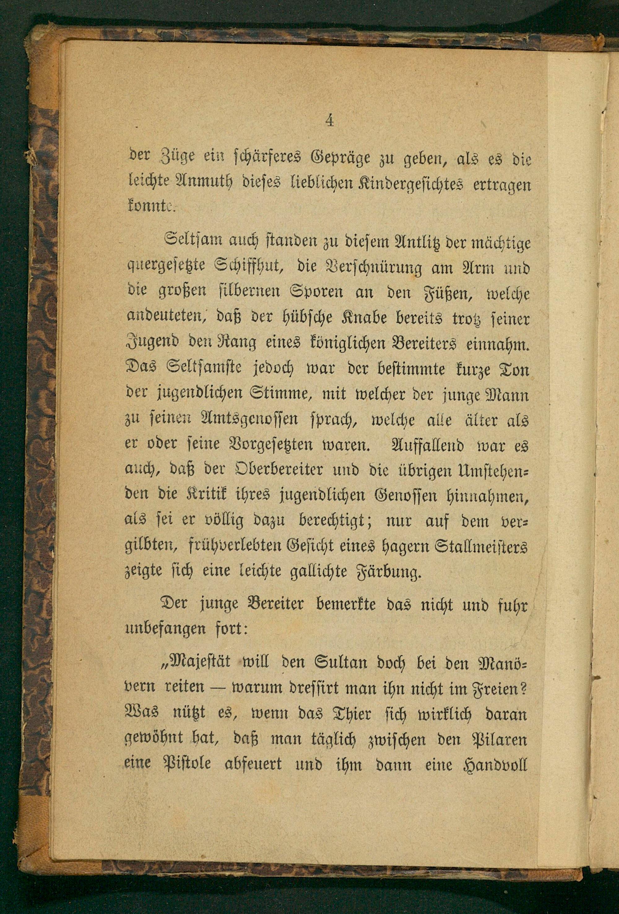 Seltſam auch ſtanden zu dieſem Antlitz der mächtige quergeſetzte Schiffhut, die Verſchnürung am Arm und die großen ſilbernen Sporen an den Füßen, welche andeuteten, daß der hübſche Knabe bereits trotz ſeiner Jugend den Rang eines königlichen Bereiters einnahm. Das Seltſamſte jedoch war der beſtimmte kurze Ton der jugendlichen Stimme, mit welcher der junge Mann zu ſeinen Amtsgenoſſen ſprach, welche alle älter als er oder ſeine Vorgeſetzten waren. Auffallend war es auch, daß der Oberbereiter und die übrigen Umſtehen⸗ den die Kritik ihres jugendlichen Genoſſen hinnahmen, als ſei er völlig dazu berechtigt; nur auf dem ver⸗ gilbten, frühverlebten Geſicht eines hagern Stallmeiſters zeigte ſich eine leichte gallichte Färbung.