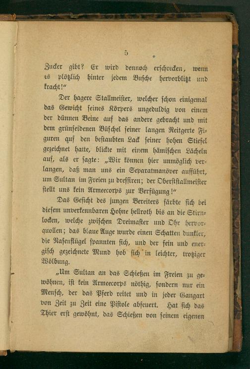 Der hagere Stallmeiſter, welcher ſchon einigemal das Gewicht ſeines Körpers ungeduldig von einem der dünnen Beine auf das andere gebracht und mit dem grünſeidenen Büſchel ſeiner langen Reitgerte Fi⸗ guren auf den beſtaubten Lack ſeiner hohen Stiefel gezeichnet hatte, blickte mit einem hämiſchen Lächeln auf, als er ſagte:„Wir können hier unmöglich ver⸗ langen, daß man uns ein Separatmanöver aufführt, um Sultan im Freien zu dreſſiren; der Oberſtſtallmeiſter ſtellt uns kein Armeecorps zur Verfügung!“