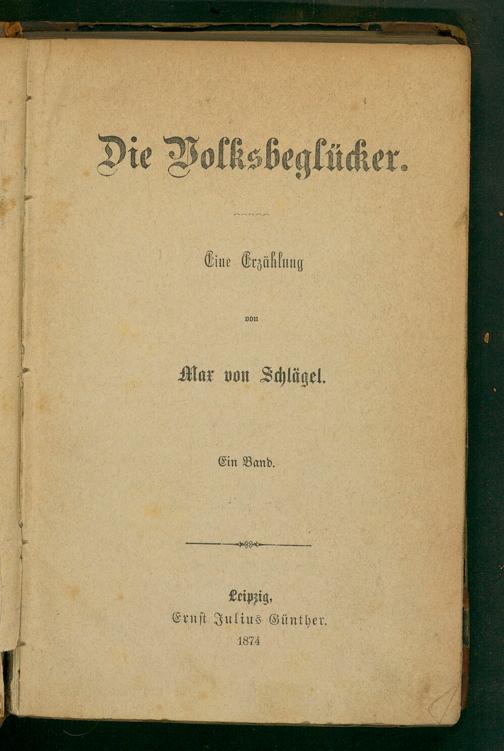 * —— e Volksbeglücker. . 9) Eine Erzählung von Mar von Schlägel. Ein Band. 87 Leipzig, Ernſt Julius Günther. 1874