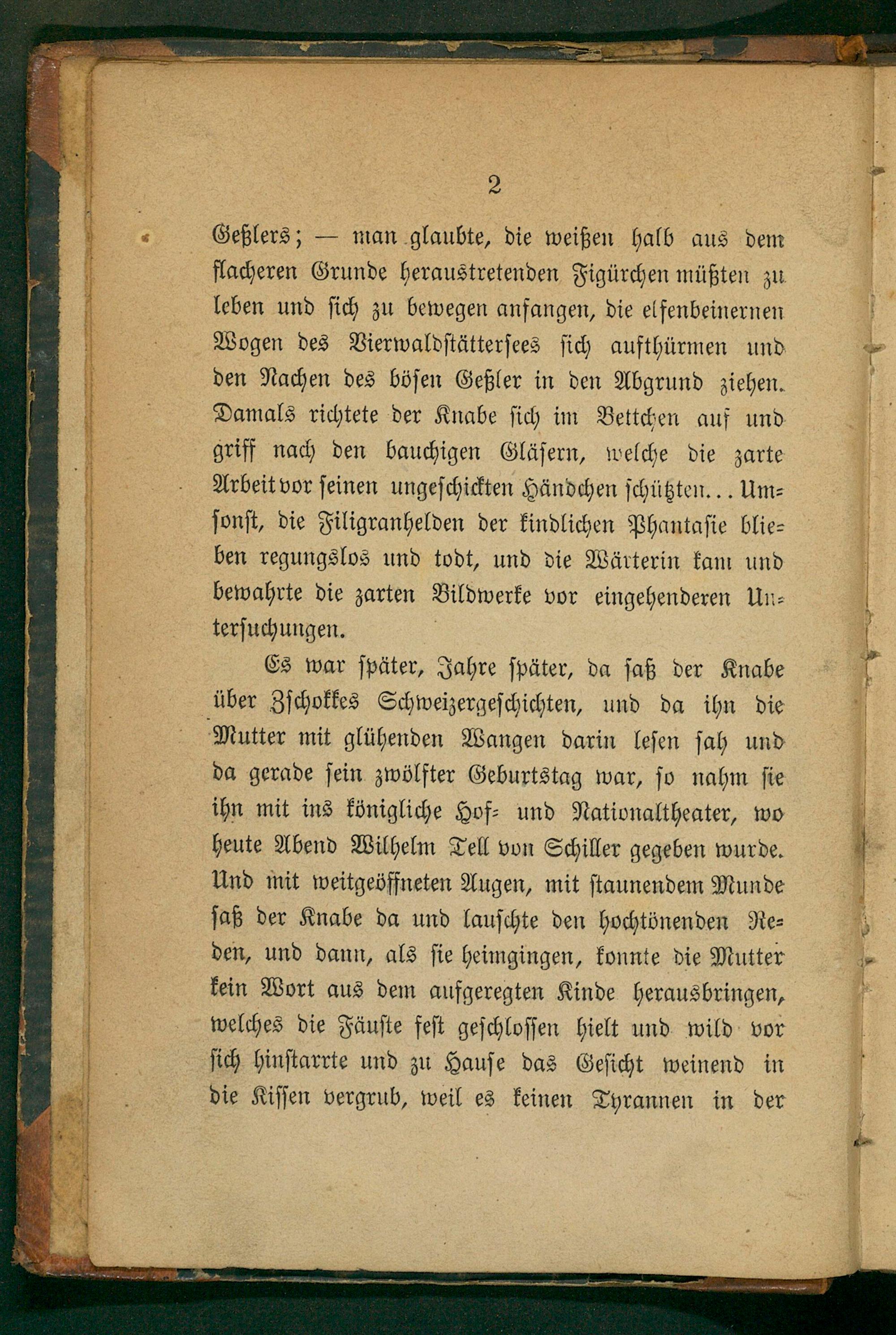 Es war ſpäter, Jahre ſpäter, da ſaß der Knabe über Zſchokkes Schweizergeſchichten, und da ihn die Mutter mit glühenden Wangen darin leſen ſah und da gerade ſein zwölfter Geburtstag war, ſo nahm ſie ihn mit ins königliche Hof⸗ und Nationaltheater, wo heute Abend Wilhelm Tell von Schiller gegeben wurde. Und mit weitgeöffneten Augen, mit ſtaunendem Munde ſaß der Knabe da und lauſchte den hochtönenden Re⸗ den, und dann, als ſie heimgingen, konnte die Mutter kein Wort aus dem aufgeregten Kinde herausbringen, welches die Fäuſte feſt geſchloſſen hielt und wild vor ſich hinſtarrte und zu Hauſe das Geſicht weinend in die Kiſſen vergrub, weil es keinen Tyrannen in der