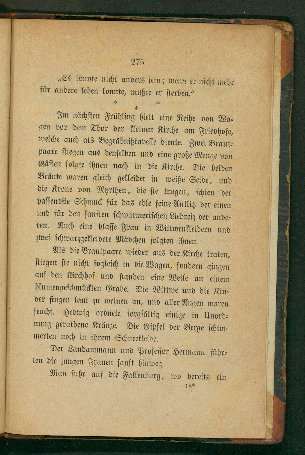 Als die Brautpaare wieder aus der Kirche traten, ſtiegen ſie nicht ſogleich in die Wagen, ſondern gingen auf den Kirchhof und ſtanden eine Weile an einem blumengeſchmückten Grabe. Die Wittwe und die Kin⸗ der fingen laut zu weinen an, und aller Augen waren feucht. Hedwig ordnete ſorgfältig einige in Unord⸗ nung gerathene Kränze. Die Gipfel der Berge ſchim⸗ merten noch in ihrem Schneekleide.