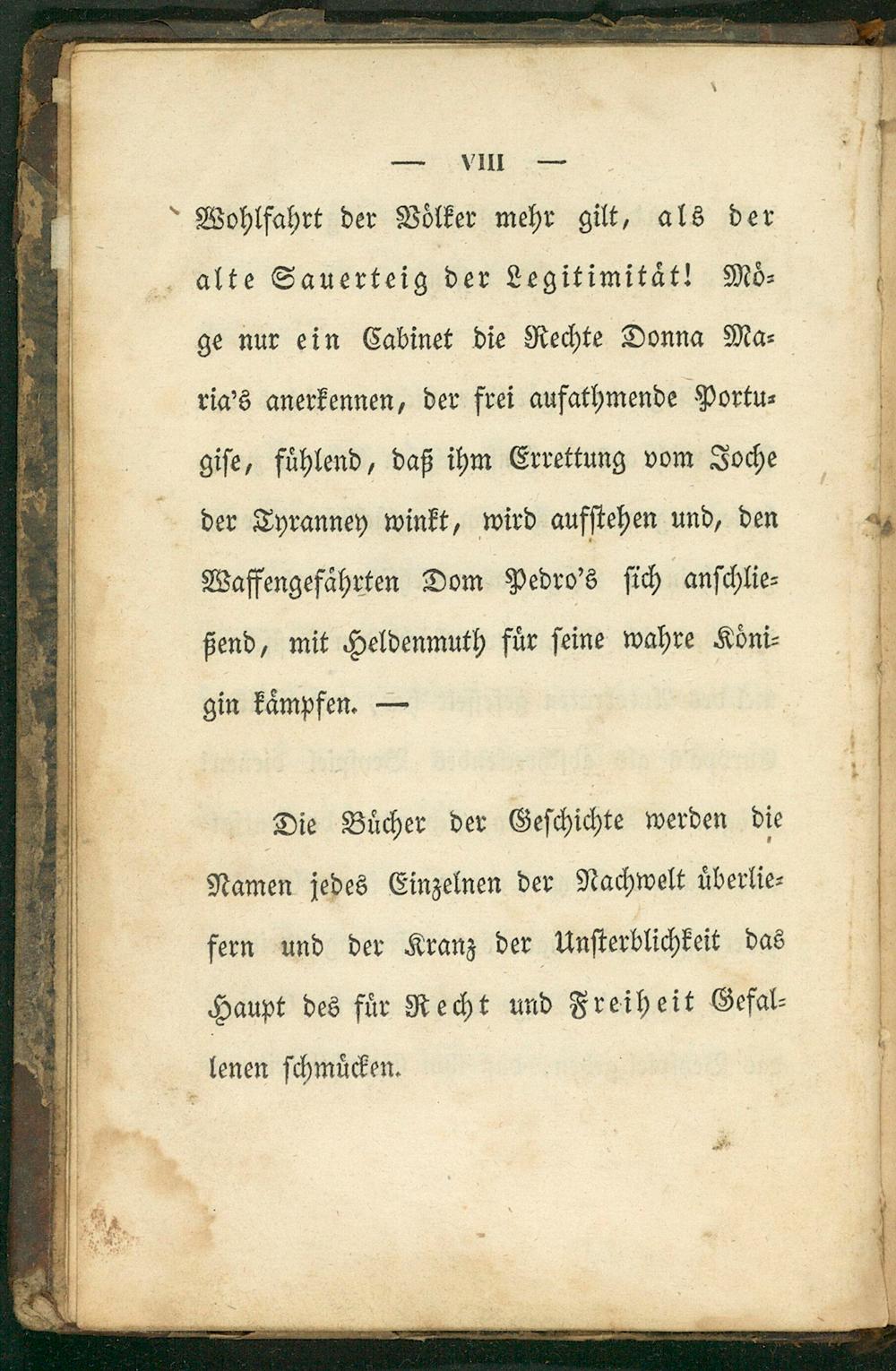 „Wohlffahrt der Voͤlker mehr gilt, als der alte Sauerteig der Legitimitaͤt! Moͤ⸗ ge nur ein Cabinet die Rechte Donna Ma⸗ ria's anerkennen, der frei aufathmende Portu⸗ giſe, fuͤhlend, daß ihm Errettung vom Joche der Tyranney winkt, wird aufſtehen und, den Waffengefaͤhrten Dom Pedro's ſich anſchlie⸗ ßend, mit Heldenmuth fuͤr ſeine wahre Koͤni⸗