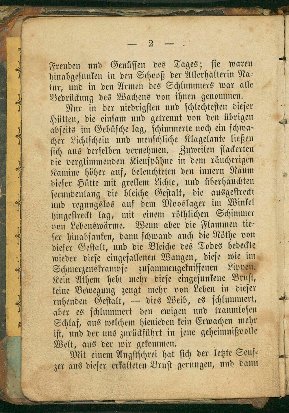 Nur in der niedrigſten und ſchlechteſten dieſer Hütten, die einſam und getrennt von den übrigen 4 abſeits im Gebüſche lag, ſchimmerte noch ein ſchwa⸗* cher Lichtſchein und menſchliche Klagelaute ließen ſich aus derſelben vernehmen. Zuweilen flackerten die verglimmenden Kienſpähne in dem räucherigen Kamine höher auf, beleuchteten den innern Raum dieſer Hütte mit grellem Lichte, und überhauchten ſecundenlang die bleiche Geſtalt, die ausgeſtreckt