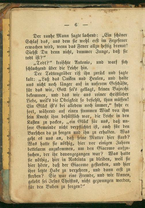 Der Todtengräber riß ihn zurück und ſagte kalt:„Laß das Quiken und Heulen, und halte uns nicht noch länger auf in unſerem Geſchäfte, für das wir, Gott ſei's geklagt, keinen Bajocchi bekommen, und das wir aus reiner chriſtlicher Liebe, weil's die Obrigkeit ſo befiehlt, thun müſſen! Ein Glück iſt's bei alledem noch immer,“ fuhr er fort, während auf einen ſtummen Wink von ihm ſein Knecht ihm behülflich war, die Leiche in den Kaſten zu packen,„ein Glück für uns, daß un⸗ ſere Gemeinde nicht verpflichtet iſt, auch für den Burſchen da zu ſorgen und ihn zu erhalten. Was geht es uns an, daß ſeine Mutter hier ſtarb? Was hatte ſie nöthig, hier vor einigen Jahren bettelarm anzukommen, um den Giacomo aufzu⸗ ſuchen, der ihr davongegangen war? Was hatte ſie nöthig, hier in Resciuta zu bleiben, weil ſie hier hörte, daß der Giacomo geſtorben, und hier ihre letzte Habe zu verzehren, und dann erſt zu ſterben? Sie war eine Fremde, und wir können, gelobt ſei Jeſus Chriſtus, nicht gezwungen werden, für den Buben zu ſorgen!“
